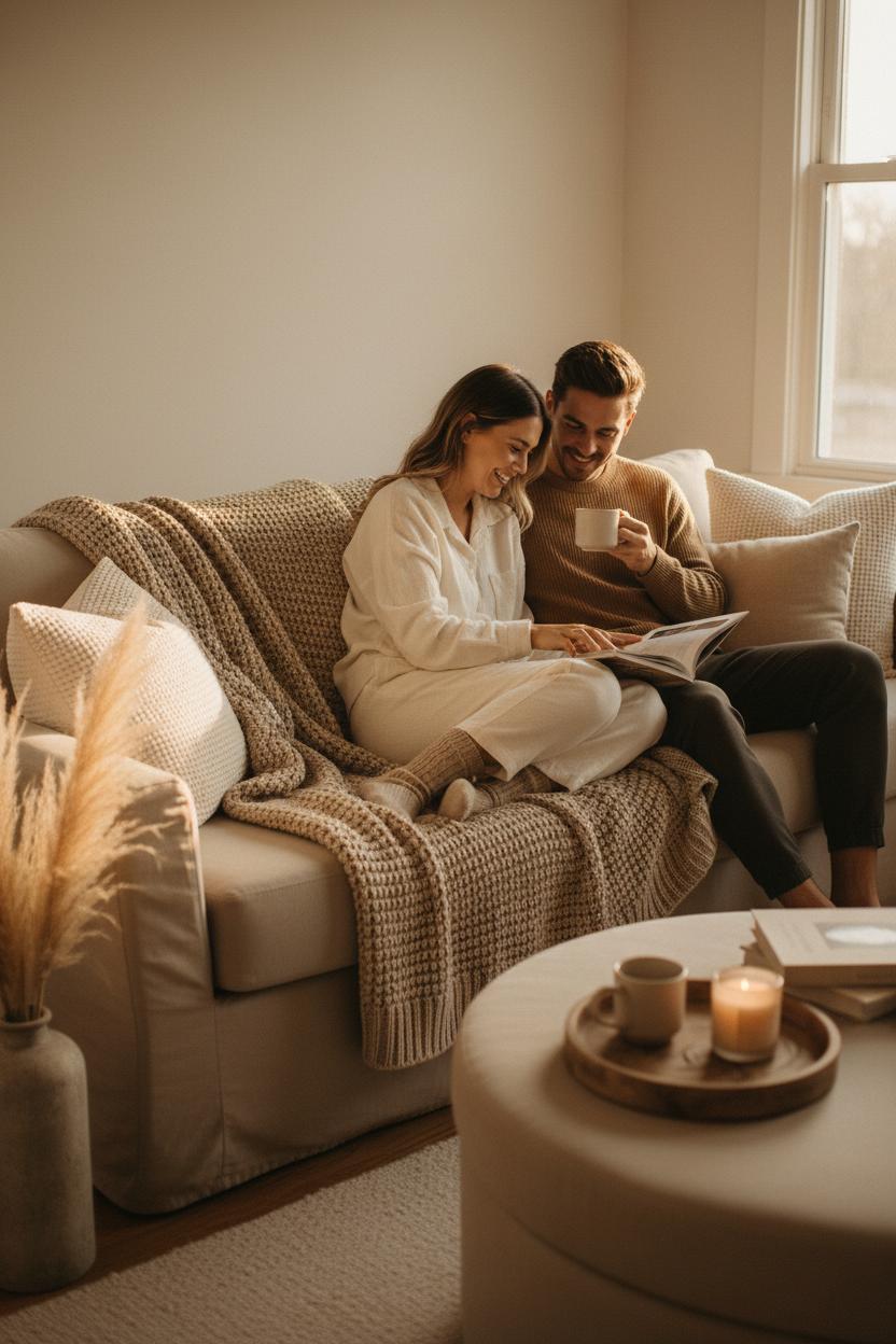 Match your textures to your outfits for that subtle, pulled-together vibe. A linen loungewear set in cream, knit socks, and a camel sweater create matching outfits that complement the sofa instead of competing with it. Keep the color story to three tones max, hide any bright clutter, and let negative space do its magic. The beige sofa cover keeps everything cohesive while the neutral throw blanket adds depth, so your connection is the focus and the room simply supports the story. Swap in seasonal throws or pillows and the setup stays fresh, but the mood remains the same: soft, warm, and perfectly suited for cozy couple photos that feel as candid as they look.