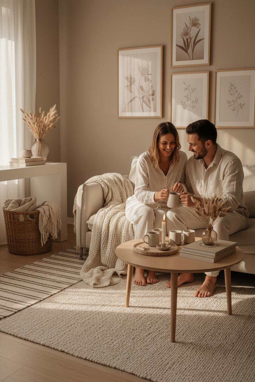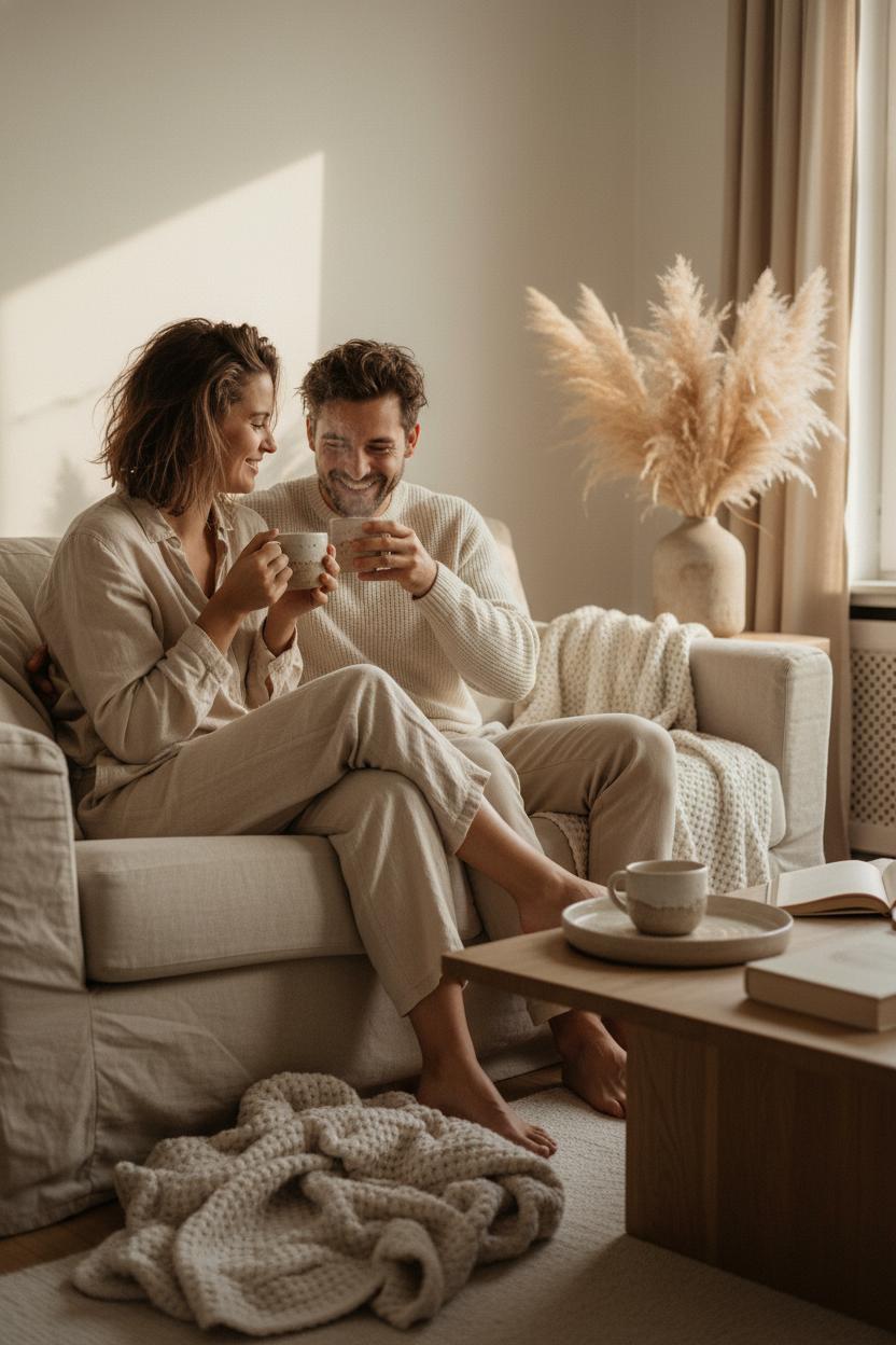 And because this whole look is about the cozy couple aesthetic, dress the scene—and yourselves. Matching outfits aren’t just cute; they tie the space and the moment together. A linen loungewear set in cream or sand photographs beautifully against a neutral backdrop. Brew something warm in that ceramic coffee mugs set, drape the neutral throw blanket over your knees, and lean into candid photography: move slowly, laugh, pour coffee, reach for each other’s hands. Golden-hour window light will turn these into cozy couple photos you’ll actually print. The beauty is that none of it requires a repaint—just thoughtful swaps, soft textures, and a few natural elements that ebb with the seasons while keeping your neutral home decor serene and story-filled.