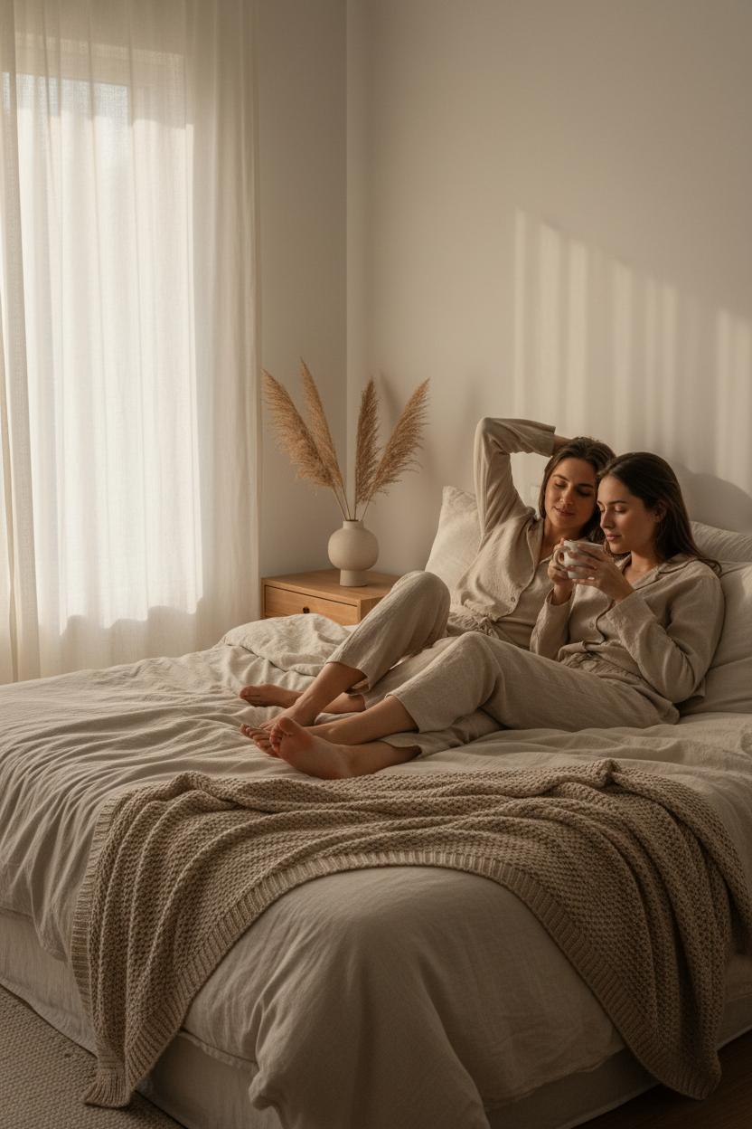 Start in the bedroom, where neutral home decor really shines through softness and texture. Layer creamy linens with a chunky neutral throw blanket at the foot of the bed, and let light filter through gauzy curtains to keep things airy. A simple vase of pampas grass decor on the nightstand adds height and a touch of romance without stealing focus. For cozy couple photos, slip into a linen loungewear set in sand or oatmeal tones—bonus points for matching outfits that look effortless rather than staged—and shoot just after sunrise when the light is gentle. Think candid photography: a quiet stretch, tangled legs, coffee in bed, and the kind of unposed closeness that makes the room feel like a sanctuary.