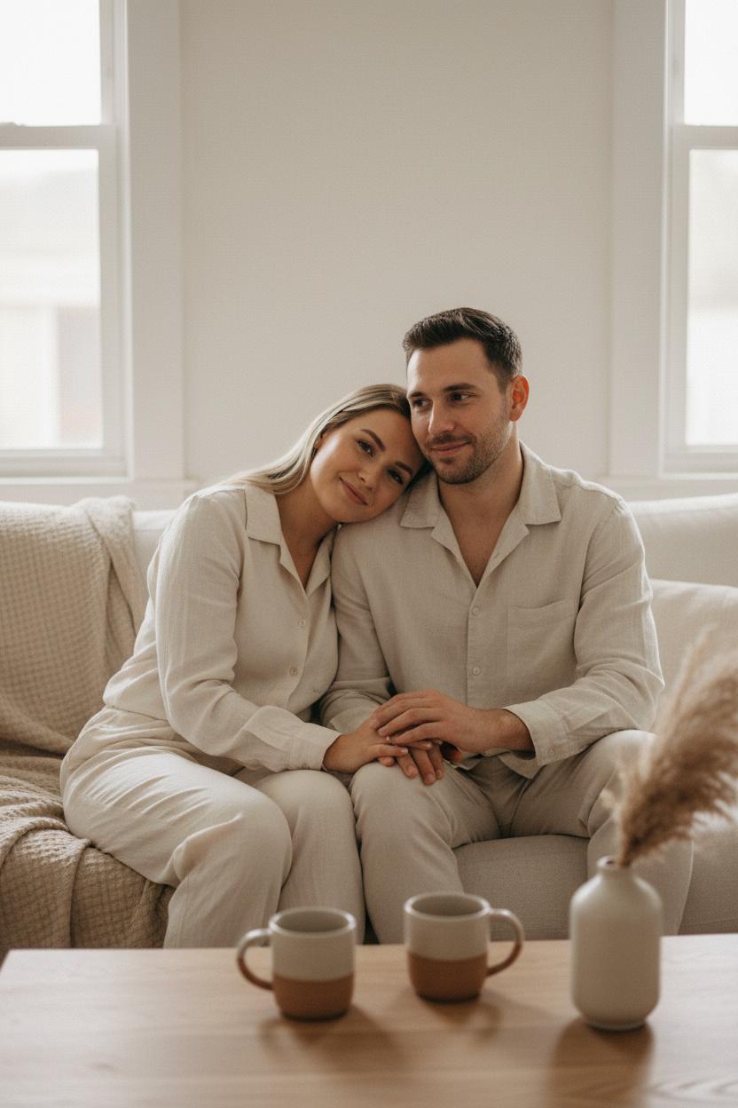 Clothes matter as much as the couch, so lean into matching outfits that harmonize, not duplicate. Think a linen loungewear set in sand next to a chunky knit in ecru, or two tones from the same family so your silhouettes read as one. The goal is a couple aesthetic that feels unforced, the kind that lets candid photography capture real laughter and sleepy Sunday energy without any visual noise. Work with window light—turn off overheads, open the curtains, and let the daylight wrap around you. If it’s dim, add a warm lamp in the background and let fairy lights blur into soft bokeh. Leave a little negative space at the edges of the frame, and use layers—pillows, throws, a textured rug—to create depth without clutter. Keep patterns subtle and skip bold logos so the eye stays on touch, movement, and breath. When the backdrop is simple and the palette is quiet, every intertwined hand, every shoulder lean, and every sip from matching mugs becomes the hero, and your space gently supports the story you’re telling together.