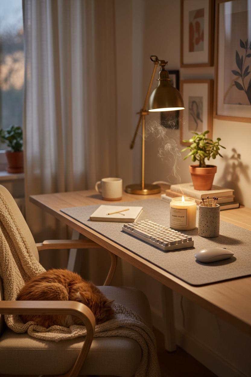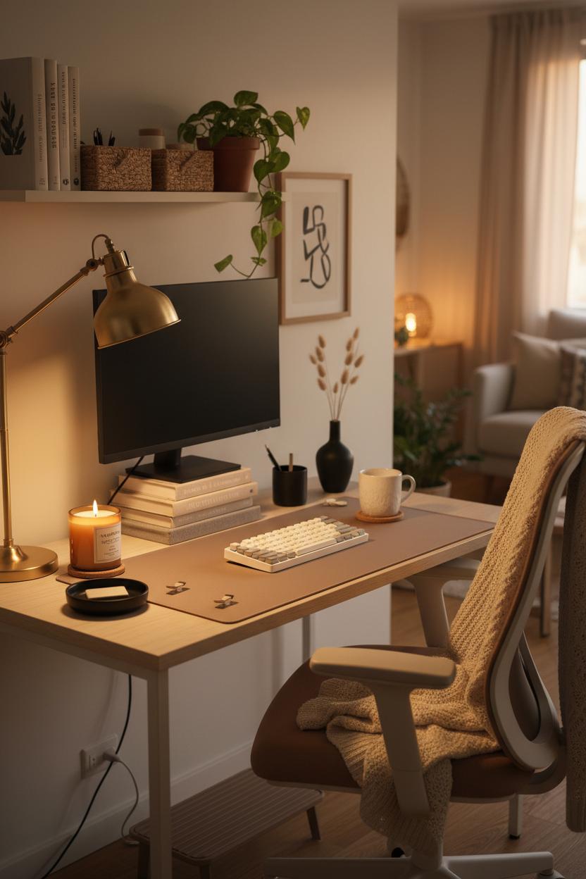 Start with mood. The quickest way to turn a plain desk into a cozy desk setup is to layer light and scent. Swap harsh overheads for a desk lamp warm light that casts a soft, golden glow across your workspace—it instantly feels like early-morning sunshine, even at 4 p.m. Pair that with a candle amber scent to ground your senses; think warm resin, a hint of vanilla, and a little crackle that makes typing feel like journaling in a quiet cabin. Add a plush throw over your chair back, a ceramic mug you love, and a framed print or two to anchor your WFH desk decor. These small touches transform function into feeling and nudge your brain into “I want to be here” mode.