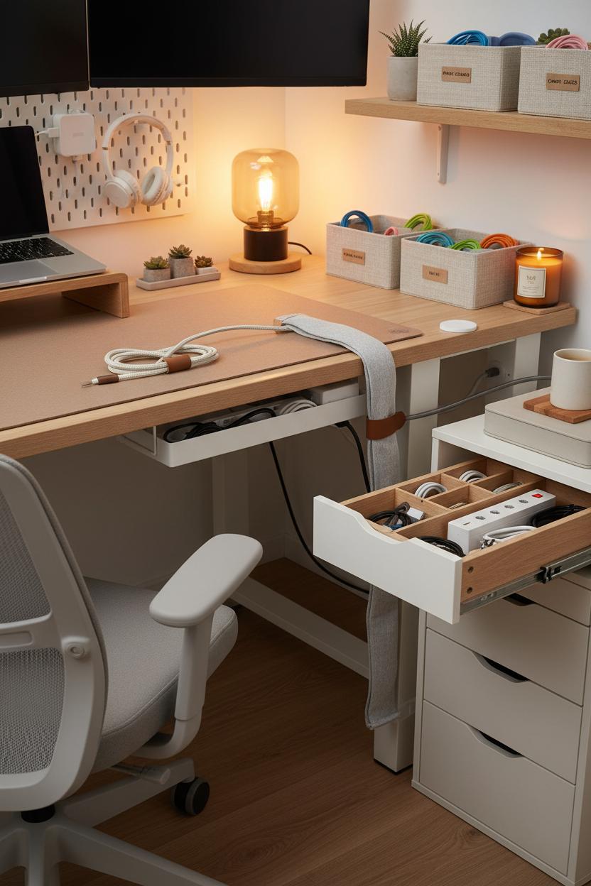 For storage, think “soft, quiet, contained.” A felt pouch or zipper case for each device’s charger prevents tangles in drawers; label the outside so you can grab and go. Roll cables into gentle figure-eights and slip them into linen boxes or woven baskets, then line them up on a shelf for soothing symmetry. Keep a shallow drawer insert near the front of your desk for adapters and memory cards, and dedicate the deeper back area to a cable box that hides the surge protector. A wide desk mat not only frames your workspace but also disguises cable routes along its edge, creating that seamless look you see in all the best home office ideas. Add a candle amber scent for a warm, lived-in vibe—just place it away from cords and paper for safety—so your tech feels at home among soft light and texture.