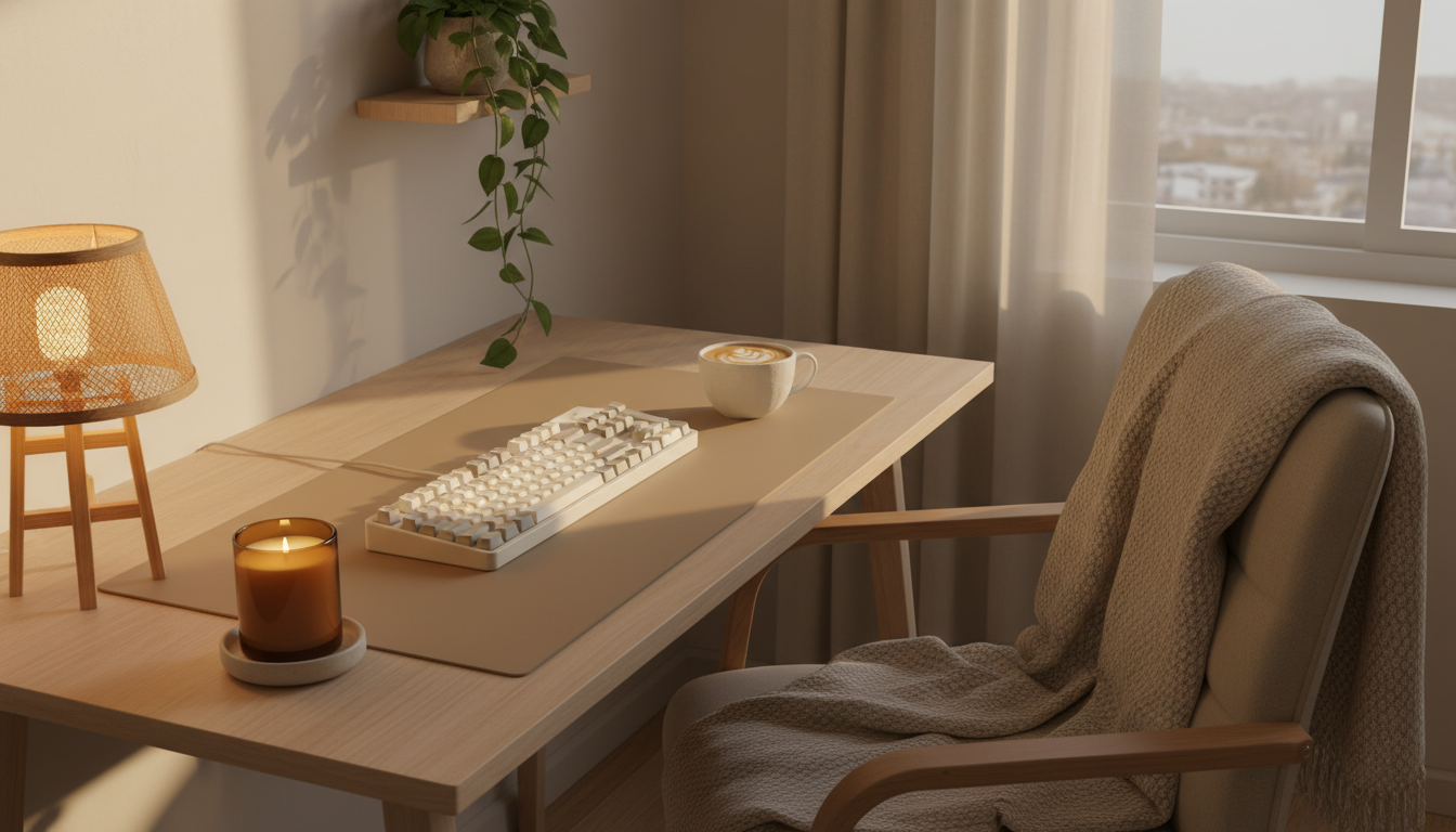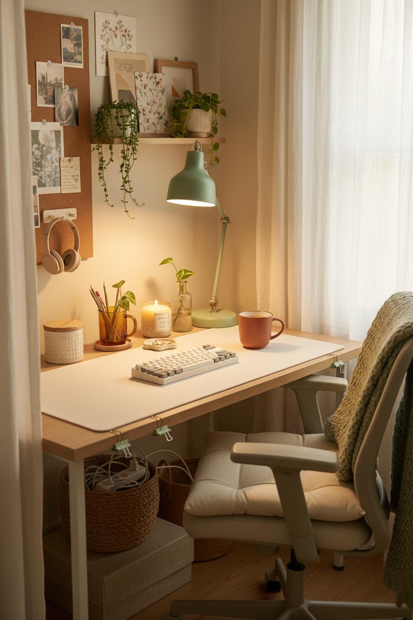 Creating a beautiful workspace doesn’t have to cost a fortune; start by shopping your home and defining a simple color story—think creamy neutrals with a hint of sage or terracotta—so every piece looks intentional. A smooth desk mat instantly elevates a surface and gives your mouse and coffee cup a cozy landing spot, while a desk lamp warm light softens harsh overhead bulbs and makes late-night emails feel calmer. Layer textures like a knit throw on the chair, a woven basket for cables, and a tiny ceramic tray for paper clips to build a cozy desk setup without buying everything new. If sound and feel motivate you, a mechanical keyboard can be affordable and adds satisfying click-clack energy; pair it with a thrifted mug as a pen holder and your space feels curated, not cluttered. For scent, try a candle amber scent to warm the room on gray mornings—bonus points if the jar is pretty enough to reuse. These home office ideas lean on little swaps that pull together an aesthetic workspace for less.