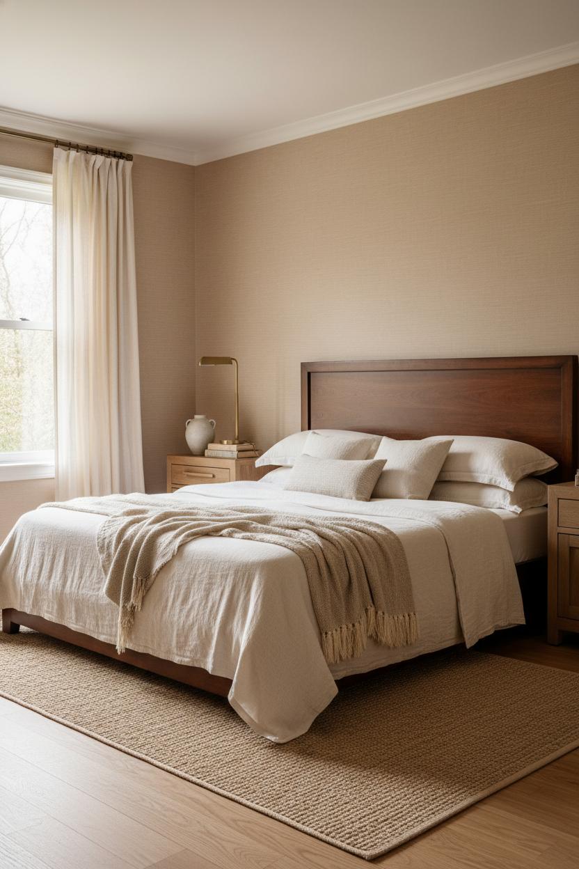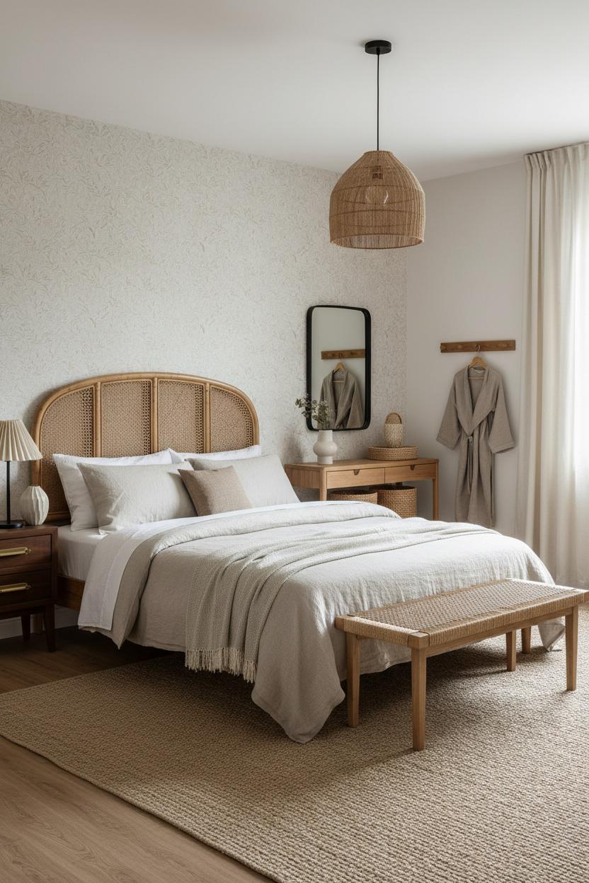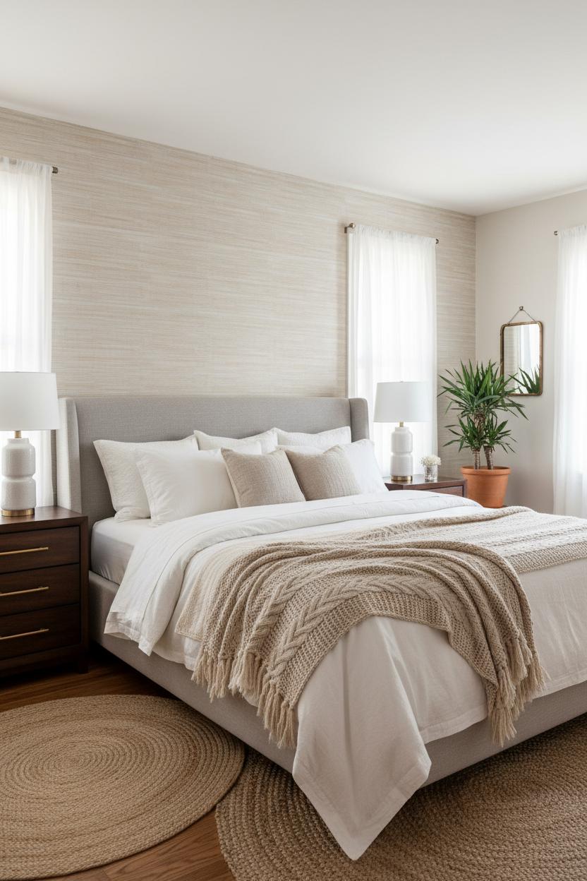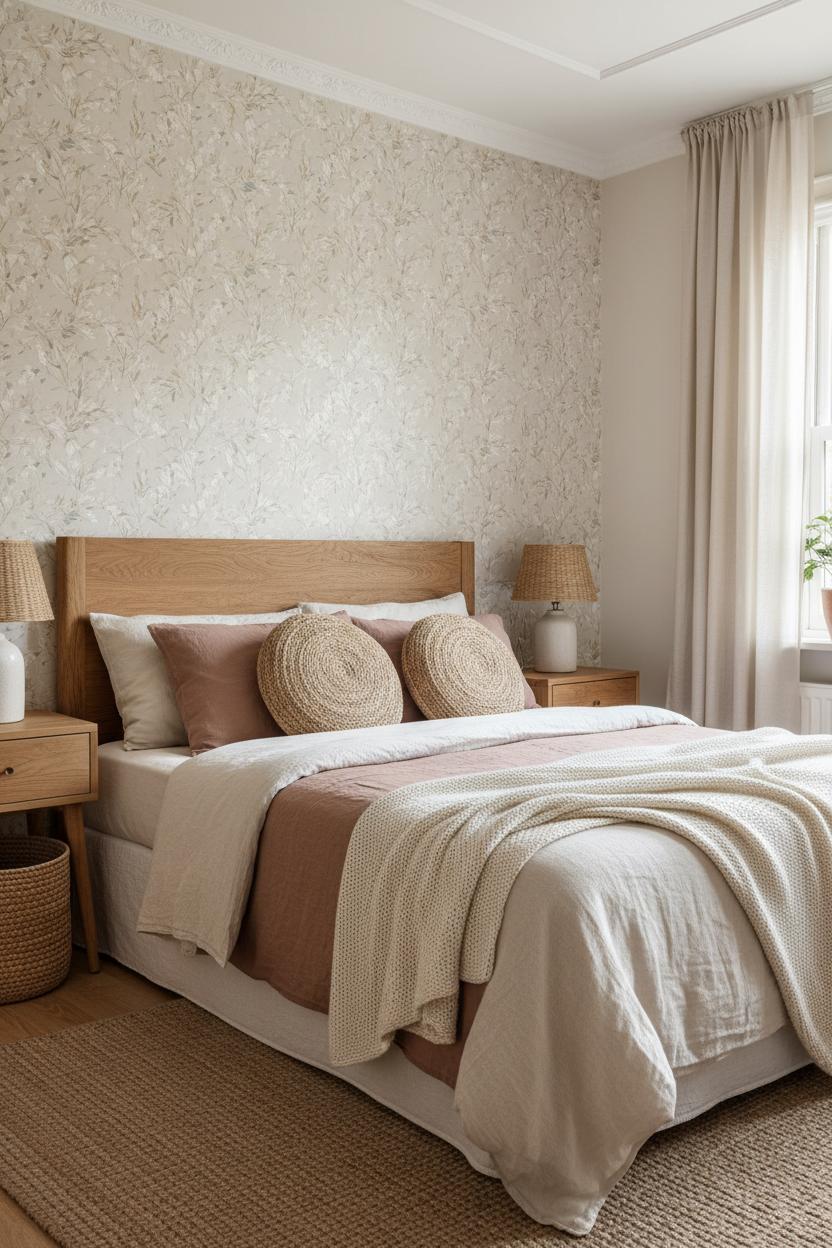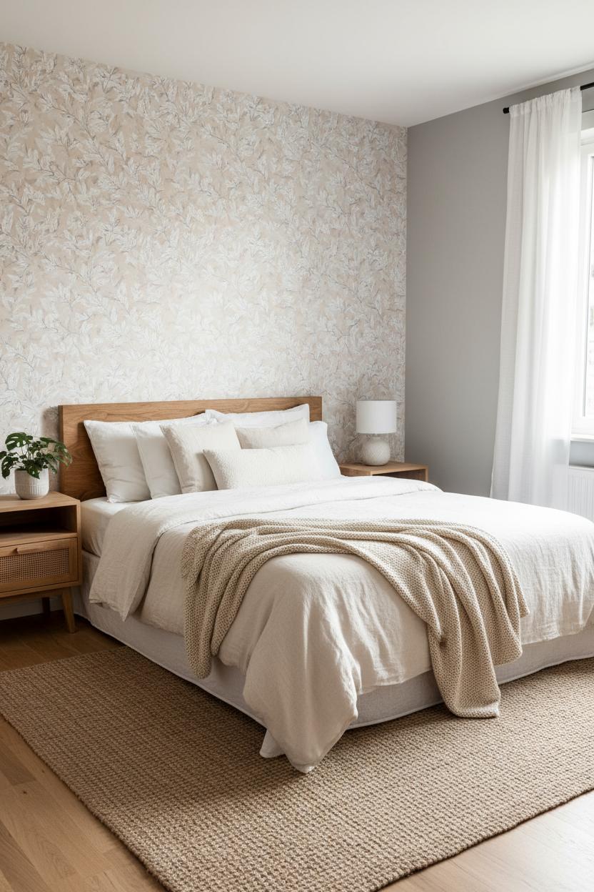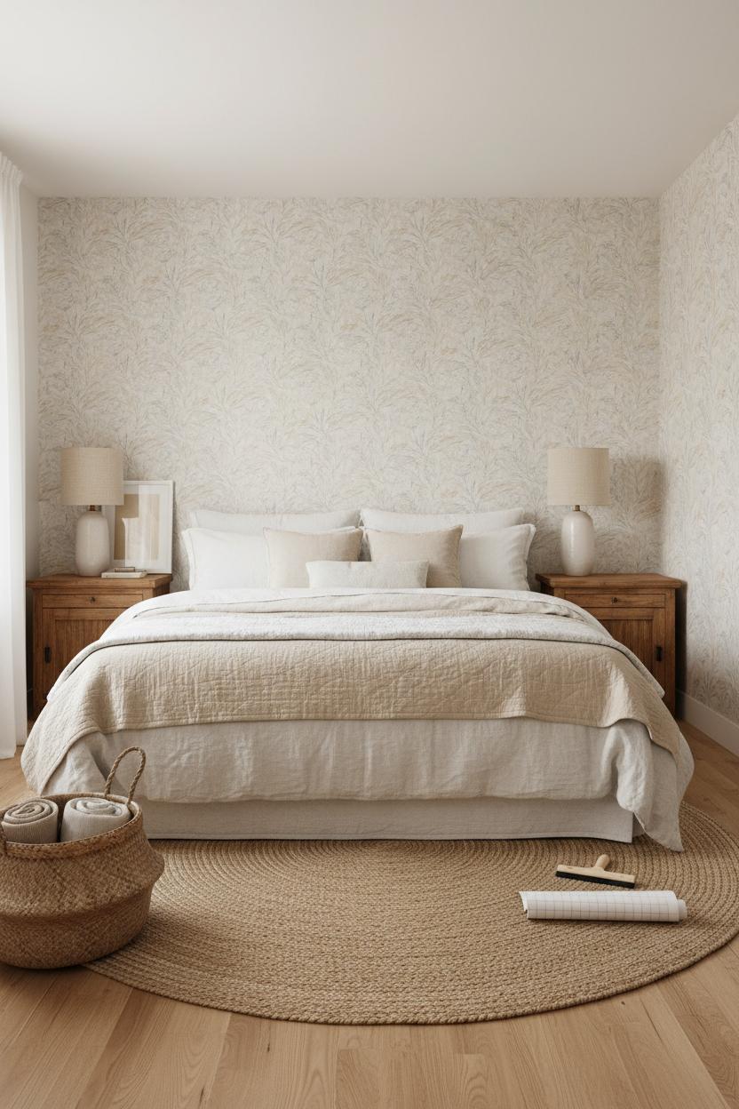 From there, make the neutrals feel rich through texture play. A bleached oak bench at the foot of the bed, a sisal or jute rug underfoot, and a pair of rattan baskets tucked beneath a console bring warmth without adding visual noise. Keep your bedroom decor cohesive by repeating materials—linen curtains that puddle lightly, a slubby throw, maybe a pleated linen lampshade—and let the wood tones vary slightly for depth (honey oak next to espresso, ash beside walnut). Add a touch of contrast with matte black or aged brass hardware so the palette doesn’t drift into flat. The beauty of peel and stick wallpaper is that you can refresh with the seasons—swap in a new neutral botanical or a subtler stripe and reposition your art without stressing. A spriggy branch in a ceramic vase, a stack of woven trays, and one perfect linen robe on a wooden peg seal the vibe: quiet, tactile, and endlessly cozy, the kind of room that invites slower mornings and softer landings at the end of the day.