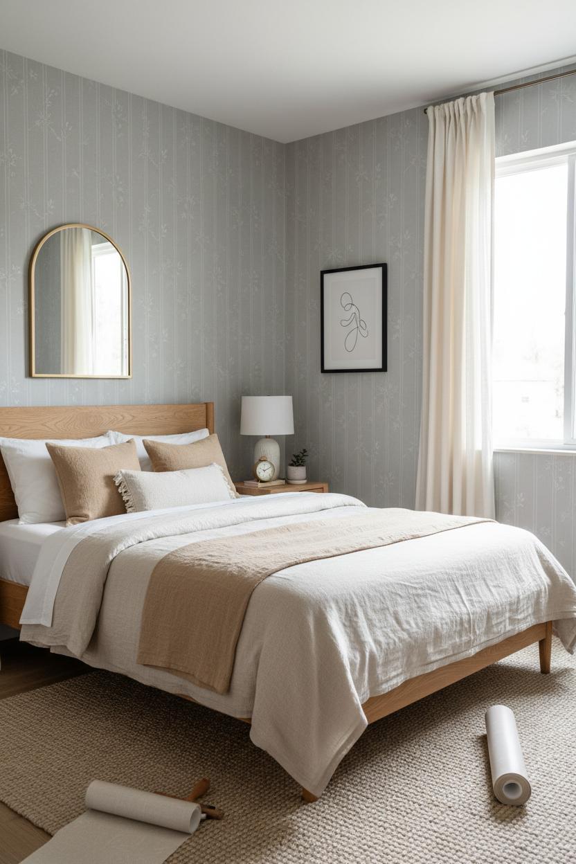 Placement matters in a small room. Paper just the headboard wall to pull the bed into focus, wrap all four walls in a delicate tone-on-tone for a cocooning feel, or do three walls and leave the window wall bare to keep the light feeling expansive. Vertical pinstripes or trailing vines will draw the eye upward, visually “raising” the ceiling, while micro-prints can disguise seams in tight corners. Choose a matte or eggshell finish to minimize glare, but lean into gentle sheen if you want extra light bounce. Style the space with layers of texture—washed linen bedding, a pale wood nightstand, rippled drapery, a woven rug—to echo the softness of your neutral wallpaper and keep the palette cohesive.