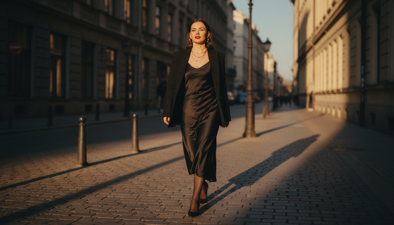 There’s something alchemical about slipping into a black satin slip dress and shrugging on a structured black blazer—the way the liquid shine of the fabric catches low light while the sharp tailoring frames your shoulders. It’s the essence of the dark feminine aesthetic: romantic, assured, and just a touch dangerous. Think moody fashion for nights that blur into mornings, museum dates that turn into martinis, and city sidewalks that shine after rain. If you love a soft goth style but want it sleeker and more wearable, this pairing is your north star. The dress brings fluid movement and that quiet, slinky confidence; the blazer brings contrast, discipline, and just enough polish to make it feel intentional rather than impulsive. Together they create a dark feminine outfit that whispers more than it shouts, letting texture and silhouette do the talking.