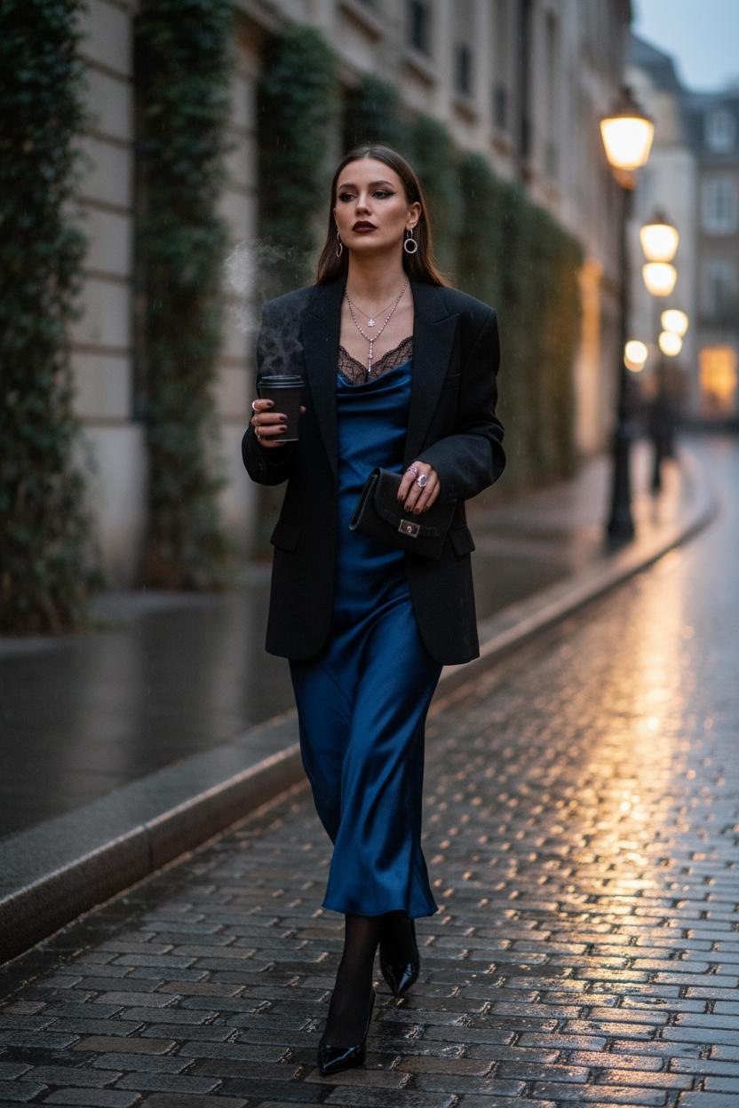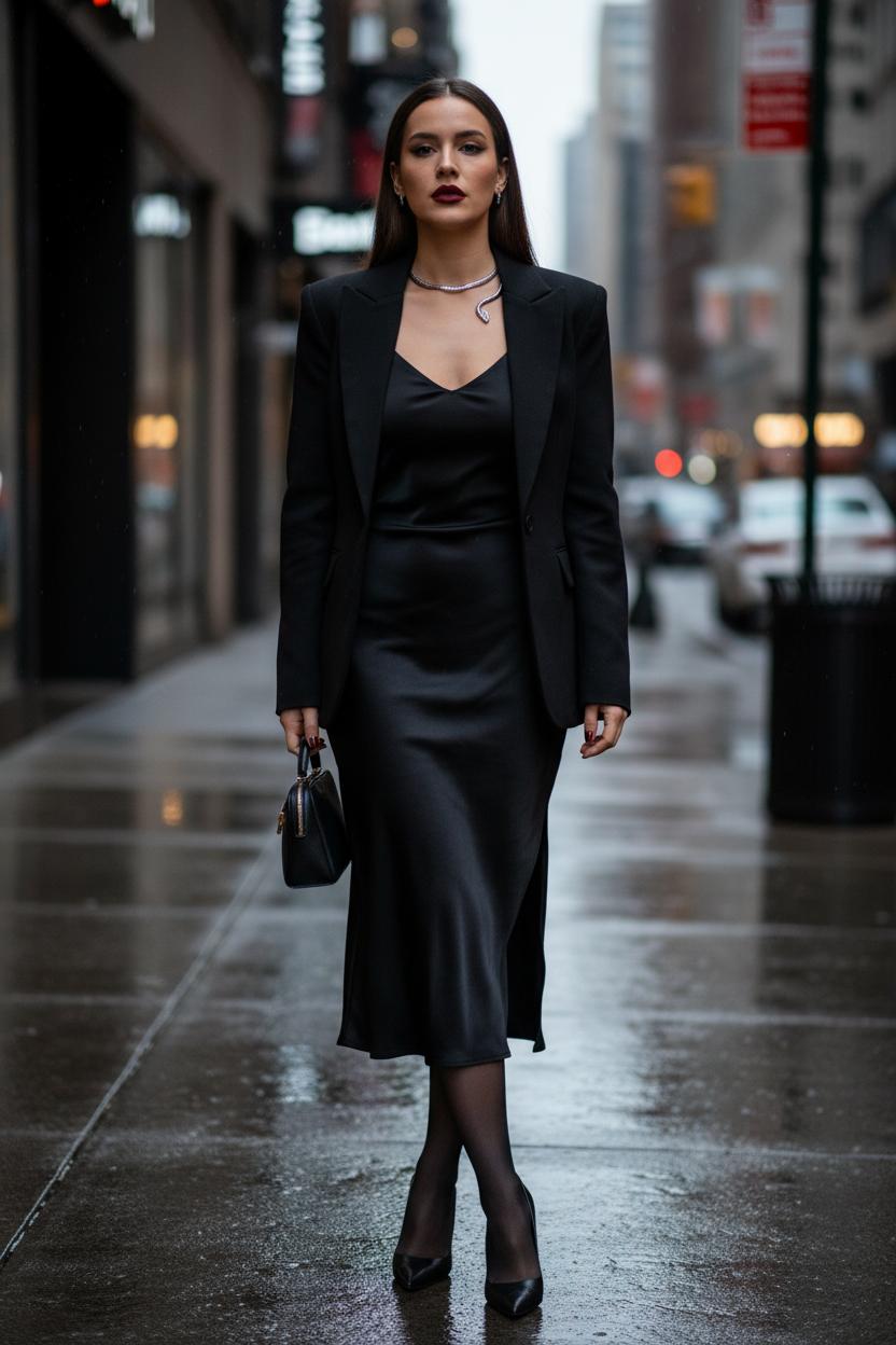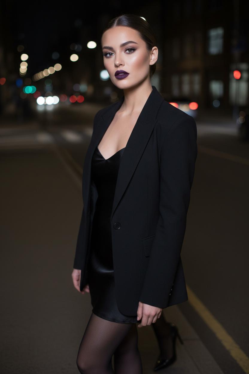 Fit matters here. Look for a bias-cut black satin slip dress that skims rather than clings, ideally midi length with a gentle slit. Your structured black blazer should have a defined shoulder and a nipped waist—or at least the illusion of one. Layer sheer tights to add a smoky veil to the look, especially for transitional evenings and fall street style. Pointed toe heels elongate the line and keep things razor-sharp; a slim belt over the blazer is optional, but beautiful if you want that hourglass snap. Keep jewelry minimal and sculptural—onyx studs, a silver serpent chain, a thin cuff. Finish with liquid dark red lipstick and smudged liner for a sultry, candlelit glow that reads powerful without trying too hard.