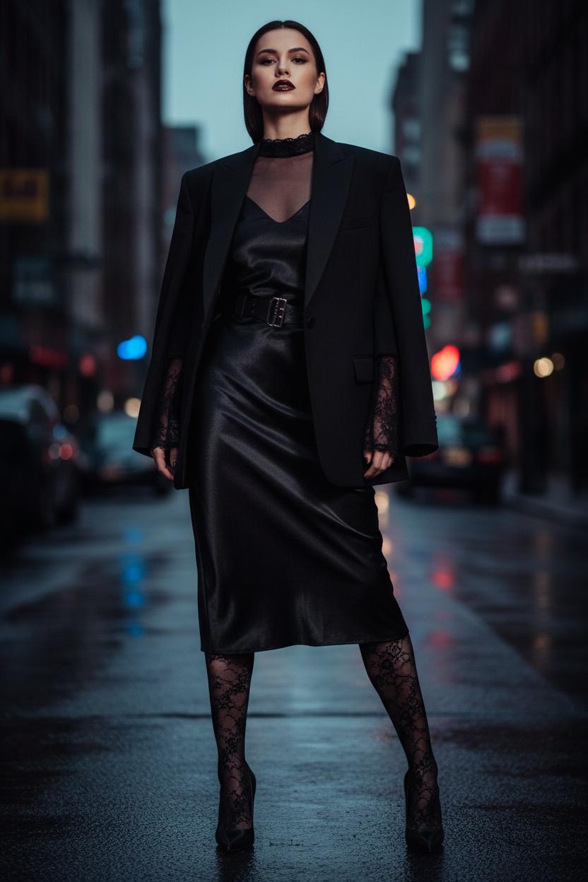 Start with a black satin slip dress as your base, and let it skim the body under a structured black blazer for a sleek, tailored contrast. Add sheer tights for a leggy, smoke-like finish and pointed toe heels to sharpen the line from head to toe. A swipe of liquid dark red lipstick takes it from “nice” to “night,” like a ribbon of lacquer tying it all together. If you want a hint more drama, try a lace turtleneck under the slip or a mesh long-sleeve layered beneath a blazer—the textures overlap in a way that reads intentional and elevated. Lace cuffs peeking from a jacket sleeve, a mesh panel at the neckline, or a satin midi skirt paired with a lace camisole—all tiny decisions that give your outfit the chiaroscuro effect you see on moodboards.