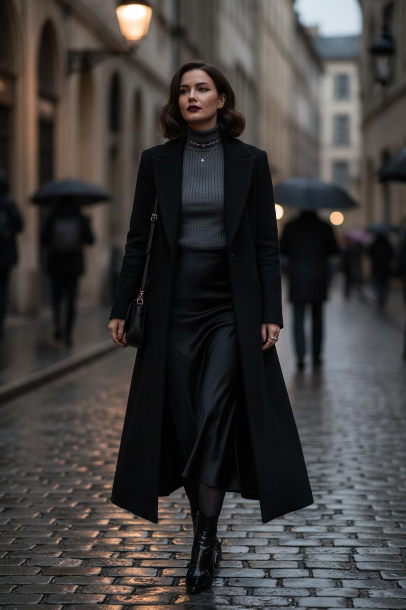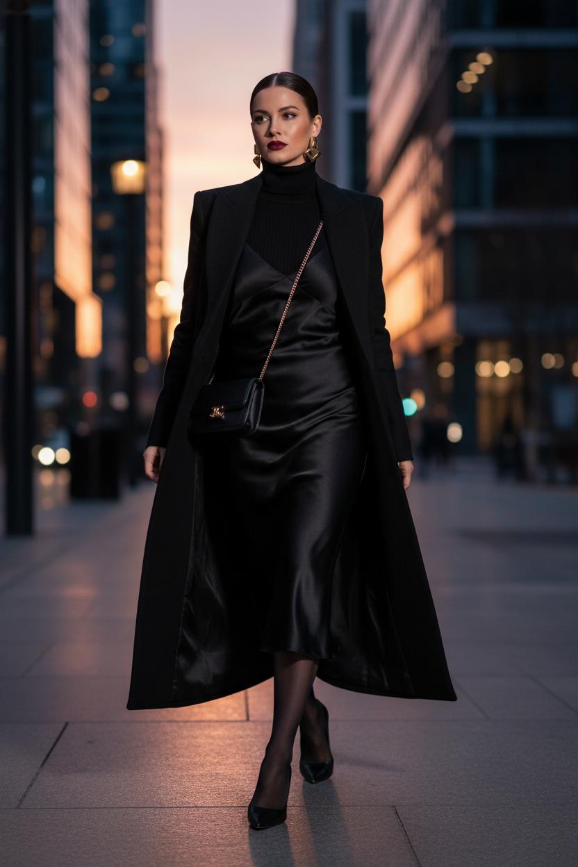 Start with a black satin slip dress and make it autumn-ready by layering a slim knit turtleneck underneath, then shrug on a structured black blazer for crisp shoulders and contrast. Add sheer tights to keep the line clean and a pair of pointed toe heels for that razor-sharp finish, or swap in lug-sole ankle boots if the forecast gets unpredictable. A long wool coat frames the whole look, while a chain-strap bag and sculptural earrings add just enough glow. For beauty, a swipe of liquid dark red lipstick seals the vibe—polished, powerful, and perfectly in step with the season.