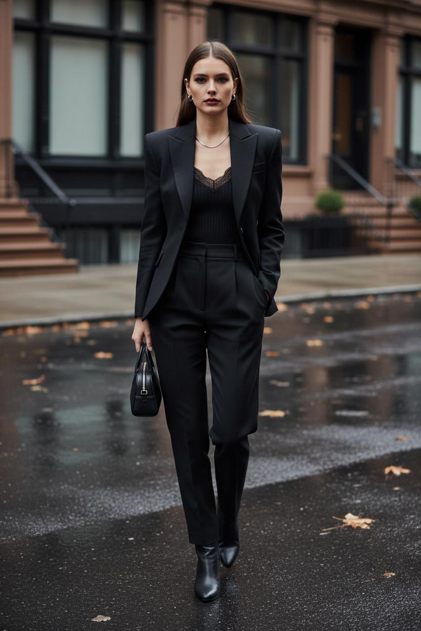 For daylight, swap the stilettos for sleek ankle boots and drape a charcoal scarf at the collar; after dusk, add a mini top-handle bag and a spritz of something smoky and floral. This palette loves inky black, oxblood, and gunmetal—tones that photograph like a dream and anchor any moodboard. The beauty of this formula is its reliability: boardroom to speakeasy, gallery to rooftop, it never feels overdressed yet always feels considered. Pin it, repeat it, and let the attitude—cool, composed, and a little untouchable—carry you.