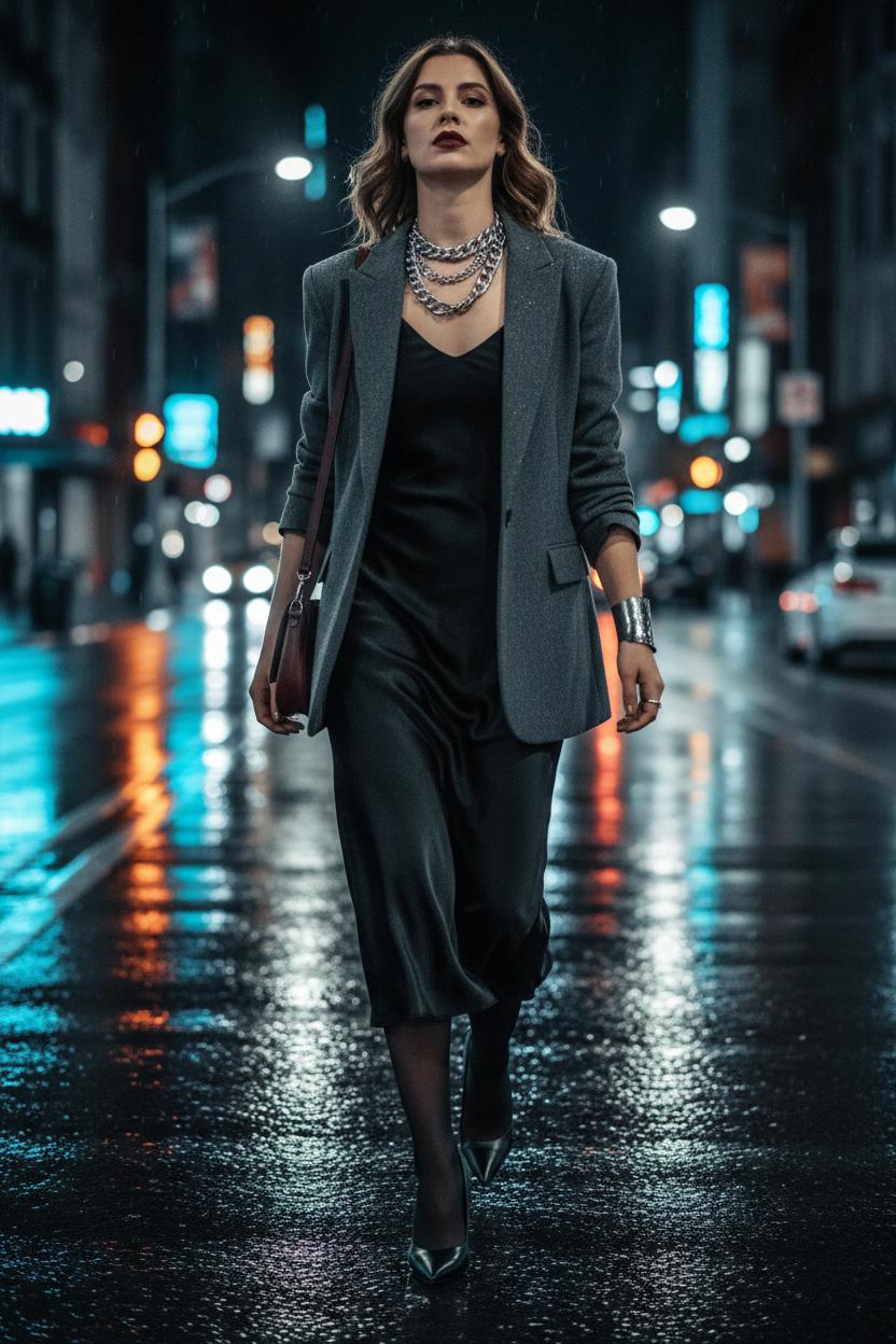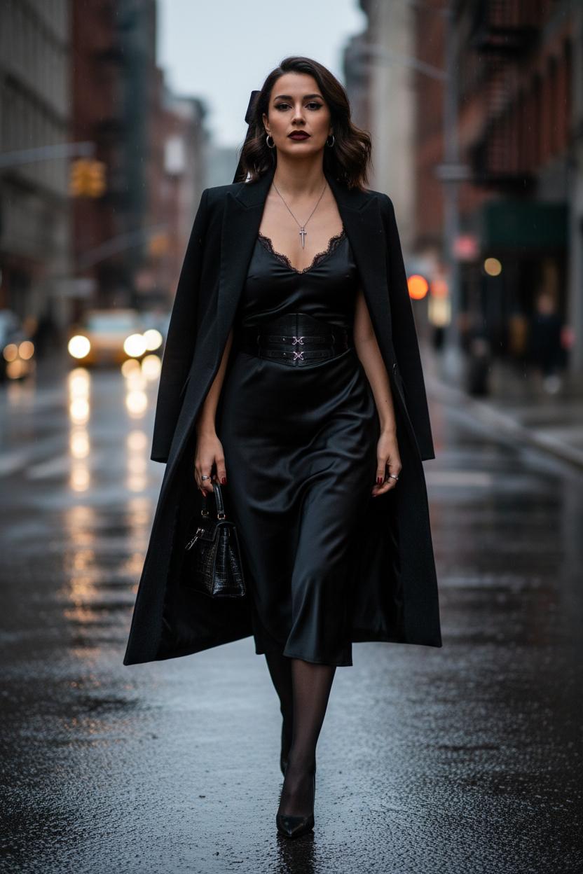 When the sun dips, the transformation is fast and delicious. Under the blazer, reveal a black satin slip dress that skims rather than clings, catching light with every step. Swap daytime boots for pointed toe heels and roll on sheer tights to elongate the leg and add a hint of glossed shadow. The blazer stays; it frames the slip like armor around silk, balancing power and allure in the ultimate dark feminine outfit. A swipe of liquid dark red lipstick becomes your after-dark signature—suddenly the same bones of the look read sultry, cinematic, and ready for a late dinner or a hidden cocktail bar. Add a chain-link necklace, a slim belt at the waist, and a micro clutch; the details are small but cutting, like punctuation marks in a short, intense sentence.