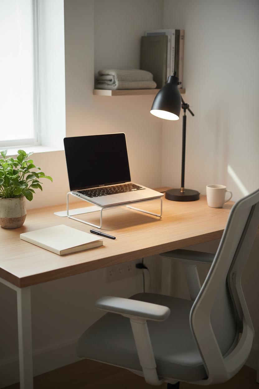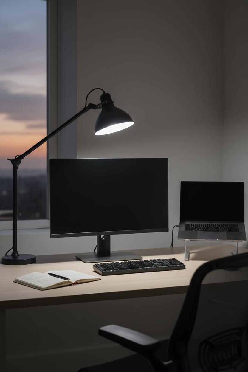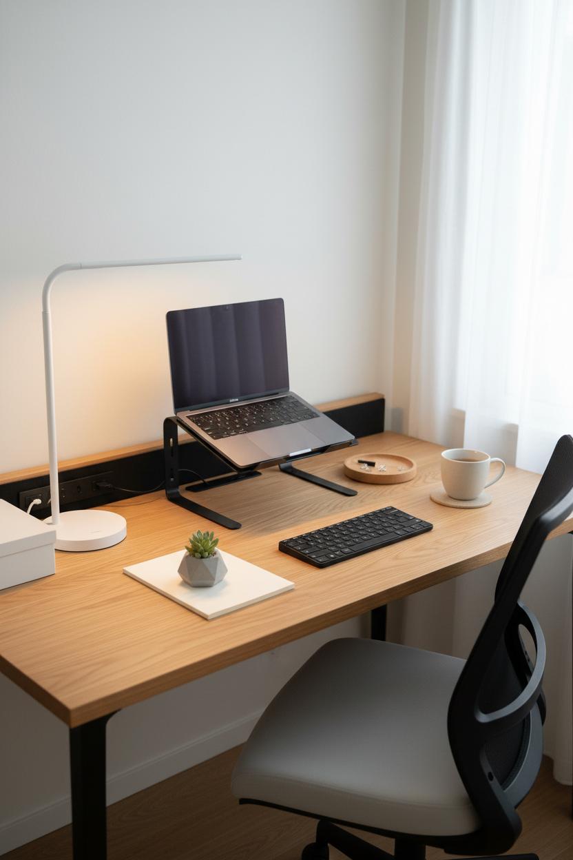 Keep the lighting gentle and purposeful. An LED desk lamp with a warm, dimmable glow keeps the vibe soft while reducing eye strain, and its small footprint maintains that minimalist desk calm. Tuck stray cords through a cable management kit along the underside of the desk or the back of the riser; when cables disappear, your mind follows suit, freeing up attention for deep work in your productivity workspace. External keyboard and mouse (wired or wireless) complete the posture-friendly setup—hands shoulder-width apart, elbows relaxed, screen right where your gaze naturally falls. If you share the desk with hobbies, slide accessories into a shallow tray under the riser to reset the space in seconds. The goal is a layout that invites you to sit down and start, no friction—just clear surfaces, aligned screens, and tools within reach. A few mindful habits seal the deal: nudge the laptop stand so its top edge matches the monitor height, step back every hour, and let the lamp’s warm pool become your cue to focus. Simple changes, beautiful rhythm, better posture.