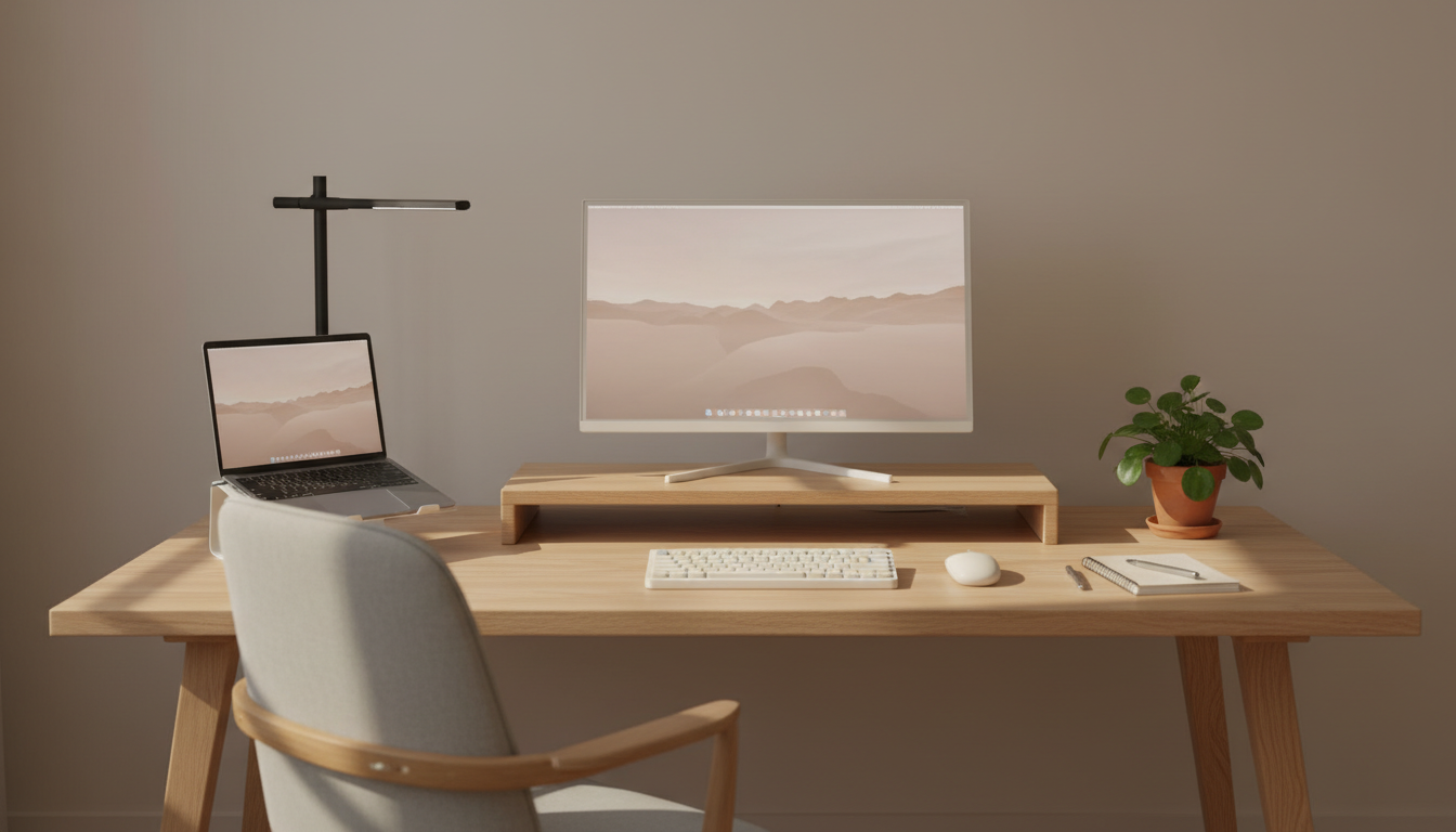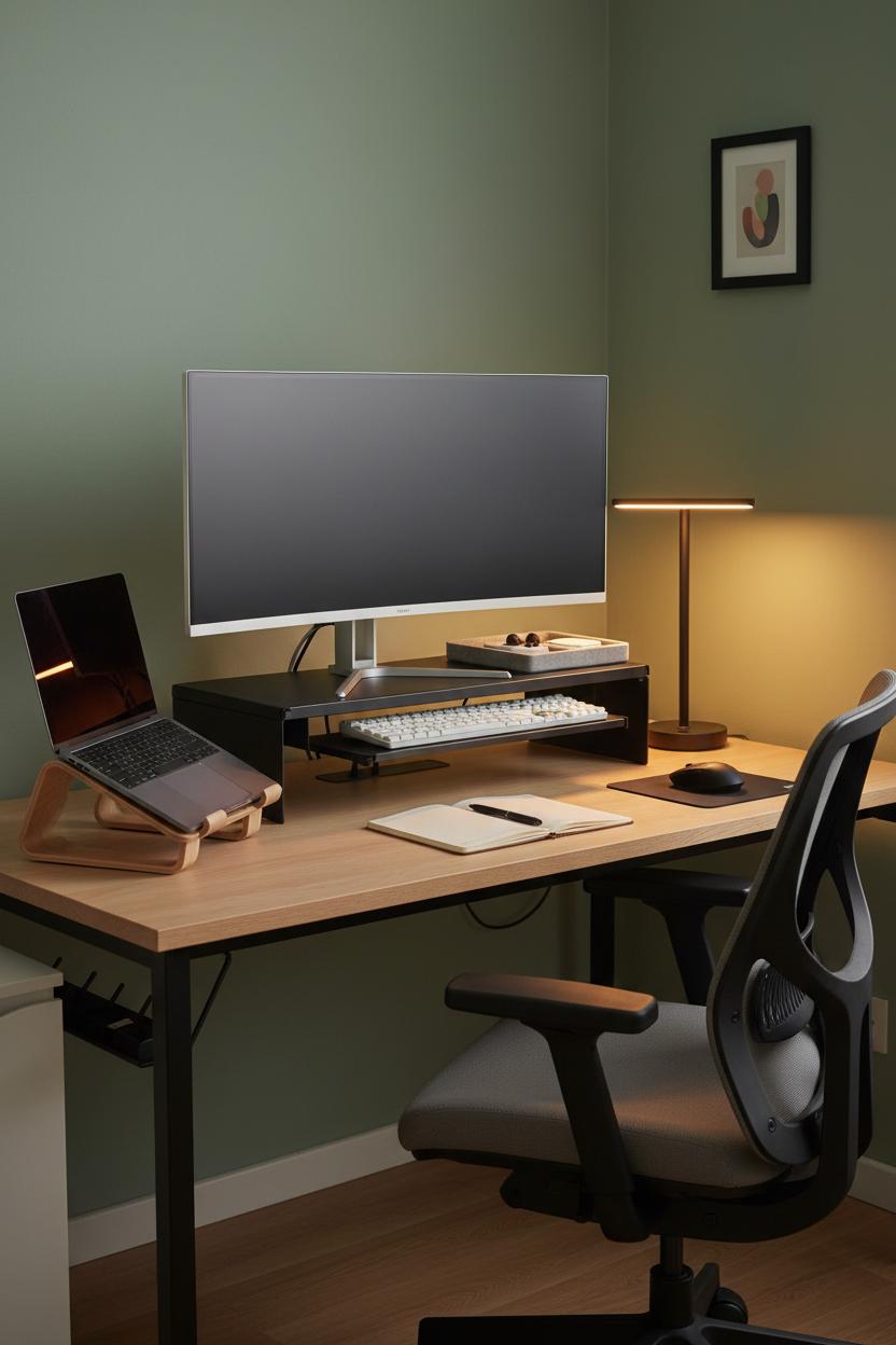 Raise your screen, save your neck. The simplest upgrade to a minimalist desk is pairing a slim monitor riser with a sturdy laptop stand so your eyeline meets the top third of the display. Suddenly your shoulders soften, your chin lifts, and your wrists find a neutral perch on the keyboard instead of hovering in midair. If you’re working from a small room desk, this combo is especially helpful—stacking vertical space makes your study desk setup feel airy, not crowded. I like a clean wood or matte metal riser that visually anchors the monitor while hiding a slim keyboard underneath when not in use. The laptop sits beside it on an angled stand, ready for notes, calls, or secondary screens without the hunched-over posture that sneaks in. Add an ergonomic desk chair set so hips and knees are at roughly 90 degrees, and you’ve got a calm, ergonomic foundation that still reads as an aesthetic study space rather than an office cubicle.
