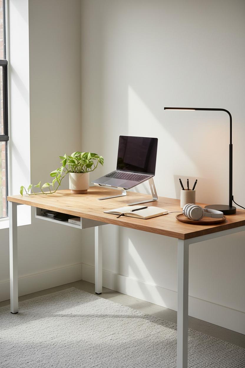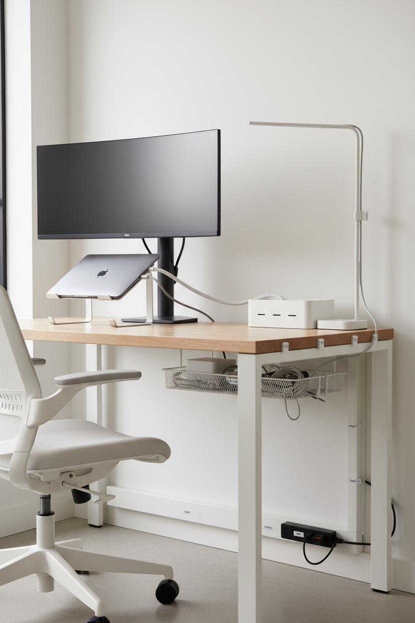 Start by elevating your tech. A simple monitor riser or a slim laptop stand creates breathing room on the surface while bringing your screen to eye level—instant posture upgrade, plus space underneath for a notebook or wireless keyboard. Pair that with an ergonomic desk chair that supports your spine without bulky lines, and suddenly your productivity workspace feels thoughtfully designed instead of improvised. For lighting, a low-profile LED desk lamp with adjustable warmth keeps eyes relaxed from morning to evening, and the small footprint keeps a small room desk feeling open. If cables are breaking the spell, a discreet cable management kit—think adhesive channels and a soft fabric sleeve—tidies the tangle along the back edge so the tabletop looks calm from every angle.