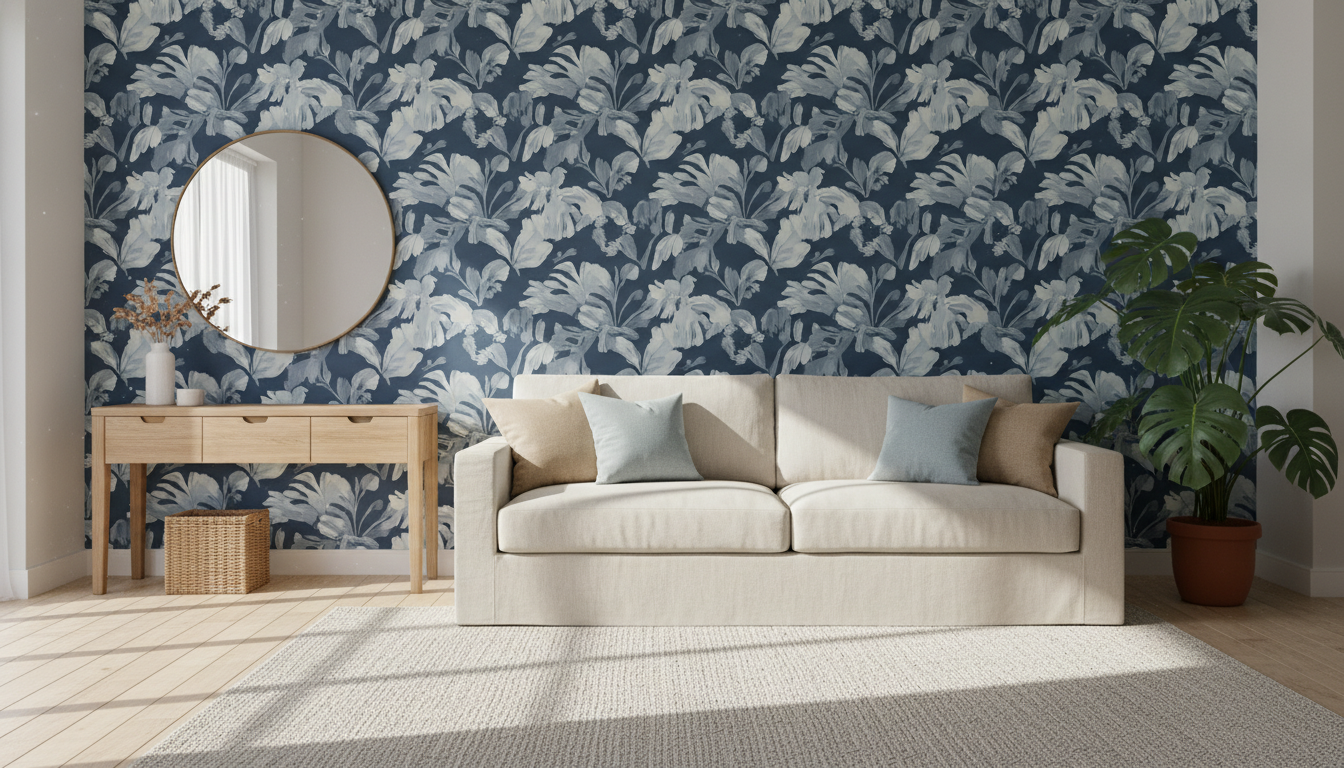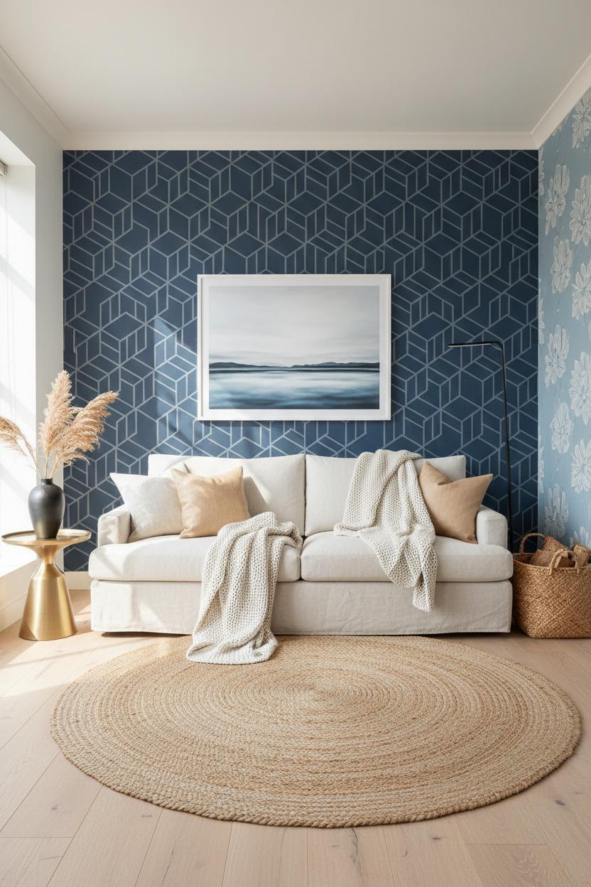 Pattern scale matters, so choose a bolder, larger motif to add dimension in big rooms, or a tighter grid for small nooks and entryways. If you’re renting or planning a quick home makeover weekend, look for peel and stick blue wallpaper for easy changes; most options are removable wallpaper, so you can test a look without commitment. Layer in nubby throws, woven baskets, and a simple landscape print to soften the edges, or mix with a neighboring wall in blue floral wallpaper for a subtle interplay of structure and softness. The navy base plays beautifully with natural light, shifting from rich and cozy at night to fresh and crisp by day—perfect for a bedroom sanctuary or a polished living room that still feels welcoming.