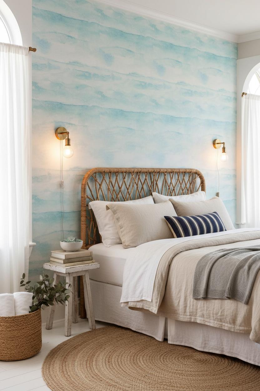 If your heart lives somewhere between the dunes and the tide line, let a breezy blue wallpaper set the scene. Think sea-glass tones, watercolor washes, and soft surf stripes that instantly calm a space and make a simple accent wall feel like an ocean view. I love starting behind the bed or sofa—one swath of blue becomes a gentle horizon that anchors rattan, linen, and driftwood textures. For an easy, renter-friendly home makeover, try peel and stick blue wallpaper in a subdued sky hue; it’s removable wallpaper, so you can play with placement and pattern without commitment. Pair it with crisp white trim, woven baskets, and a jute rug for effortless coastal decor, then add a brass sconce or two for that sun-on-the-water glint. If you crave a bit more structure, navy geometric wallpaper brings a nautical polish—think yacht-club stripes or clean lattice—while still reading beachy when layered with airy sheers and sandy neutrals.
