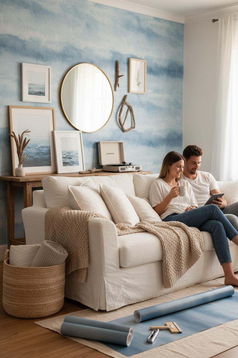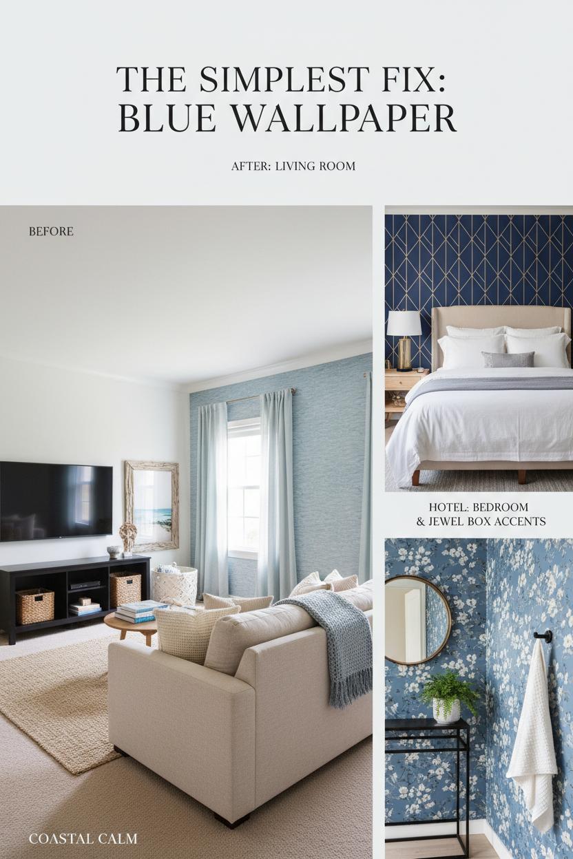 If you love a satisfying before-and-after, start with the simplest fix: a serene blue wallpaper accent wall that steals the show without stealing your weekend. Picture a tired, all-beige living room—flat sofa, blank TV wall, no personality. Now imagine adding peel and stick blue wallpaper behind the media console, anchoring the space with a cool, ocean-kissed hue. Suddenly the woven basket, driftwood frame, and linen curtains make sense, and your coastal decor looks curated instead of accidental. The blue grounds the room while keeping it air-light, and a stack of coffee table books plus a pale jute rug tie everything together. It’s proof that modern wallpaper can be calm, not loud—like a deep breath for your home.