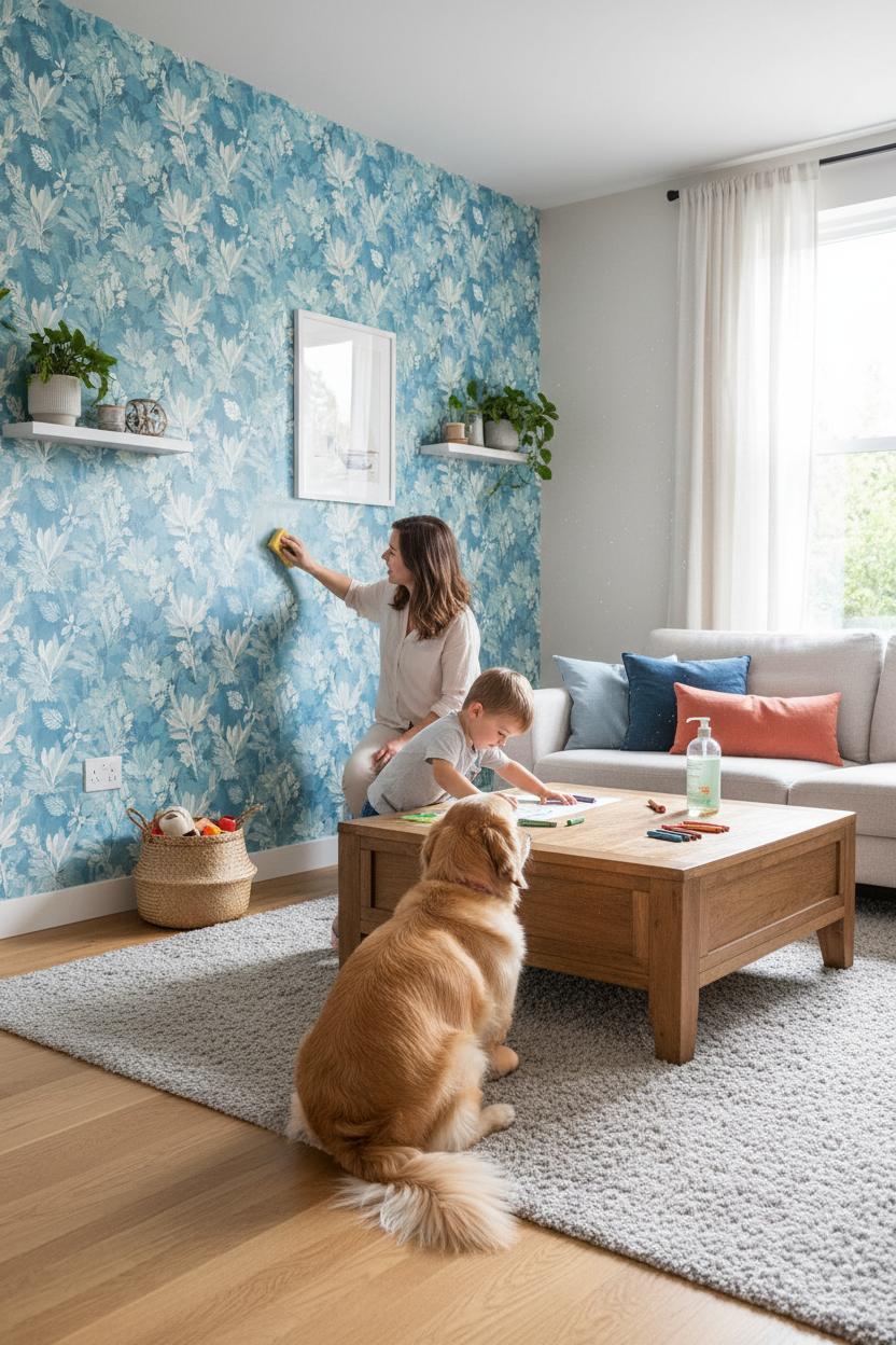 If your home is full of tiny fingerprints and wagging tails, you can still create a serene blue moment that actually works for real life. Look for removable wallpaper with a wipeable finish—peel and stick blue wallpaper is a lifesaver when spaghetti night or a muddy paw meets your favorite accent wall. Today’s blue wallpaper options are surprisingly durable: think thicker vinyls with a subtle sheen that shrug off smudges and crayon marks, and printed inks that won’t lift when you swipe with a damp cloth. It’s the practical path to a calm, collected corner that stands up to everyday chaos and still delivers that instant home makeover glow.