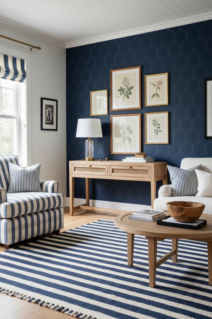 When you’re pairing patterns with a blue wallpaper accent wall, think of it like styling your favorite outfit—balance, scale, and a touch of shine make everything feel intentional. Start with your hero: a dreamy blue floral wallpaper for softness or a crisp navy geometric wallpaper for structure. If your print is bold, bring in stripes in a smaller scale on throw pillows, a bench cushion, or Roman shades. The subtle rhythm of slim pinstripes keeps the eye moving without competing. If your wallpaper is more delicate, go bolder with a ticking stripe rug or wide-striped bedding to ground the room. This layered mix feels especially fresh in coastal decor, where those breezy blues and easygoing lines echo beach umbrellas and shoreline shadows.