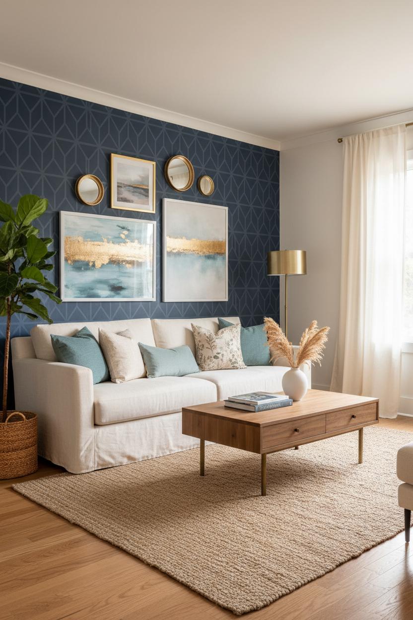 Finally, layer in metals for that polished “finished” moment. Brass or champagne gold warms up navy and teal, while brushed nickel and pewter cool down lighter sky blues; matte black adds graphic punctuation that plays beautifully with stripes. Echo metal finishes on curtain rods, picture frames, and a statement table lamp to create quiet continuity across the accent wall. If you’re tackling a weekend home makeover, peel and stick blue wallpaper or other removable wallpaper makes experimenting low-stress, and a wallpaper smoothing kit keeps seams tidy and bubbles at bay. Renters can test a moody corner with a single panel; homeowners can wrap a niche or headboard wall for instant depth. Whether you lean floral, geometric, or stripe-forward, the mix of pattern, wood tones, and metals brings dimension—and that effortless, layered look that photographs beautifully and feels even better in person.