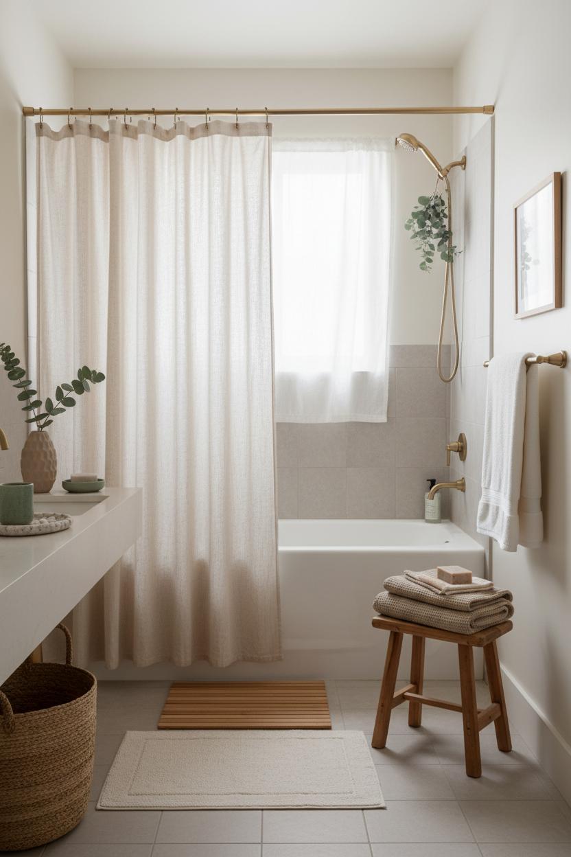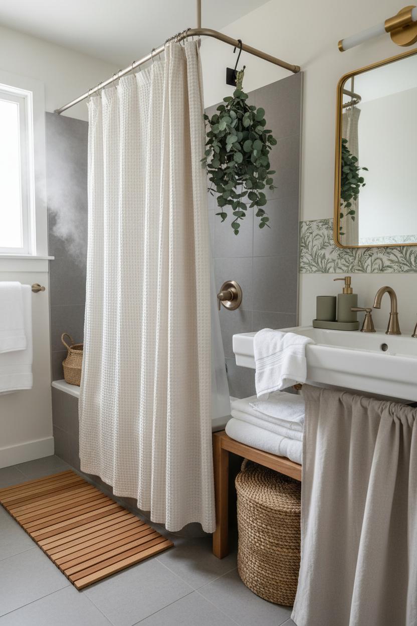 Start with the biggest canvas in a tiny space: your shower curtain. Swapping in an extra-long, linen-look or waffle weave curtain instantly makes the ceiling feel higher and sets the tone for a spa bathroom without a single tile change. Go soft and serene with white, sand, or misty gray, or bring in a subtle pattern like thin pinstripes for a polished hotel vibe. Hang it high on matte gold bathroom hardware for a quiet glint and use a curved tension rod to create elbow room in a small footprint—totally renter friendly and no drill needed. Pair it with a weighted liner so everything hangs beautifully, and tuck a eucalyptus shower bundle over the shower head for that steamy, botanical aromatherapy moment. It’s one of those bathroom ideas that feels indulgent but costs less than brunch with friends.