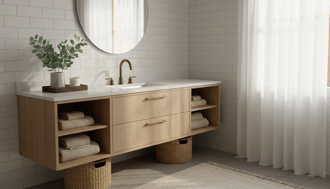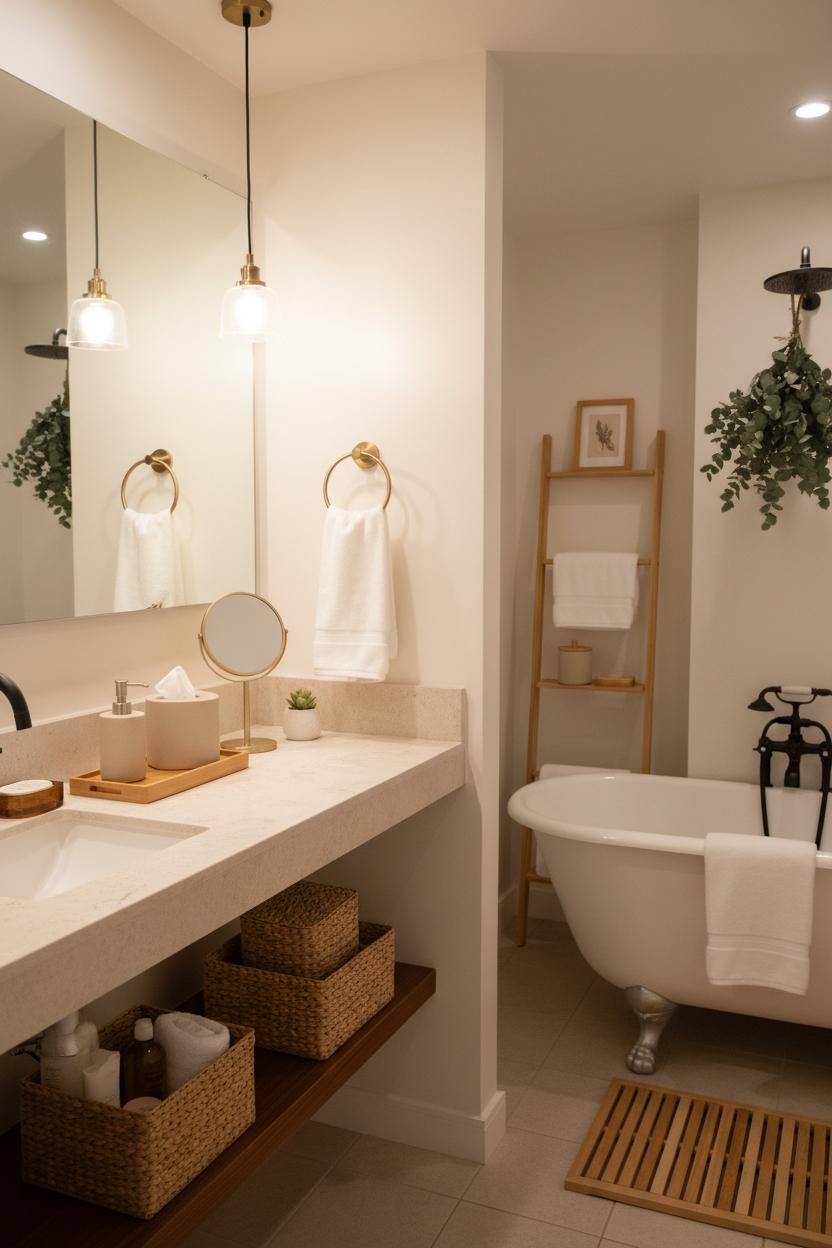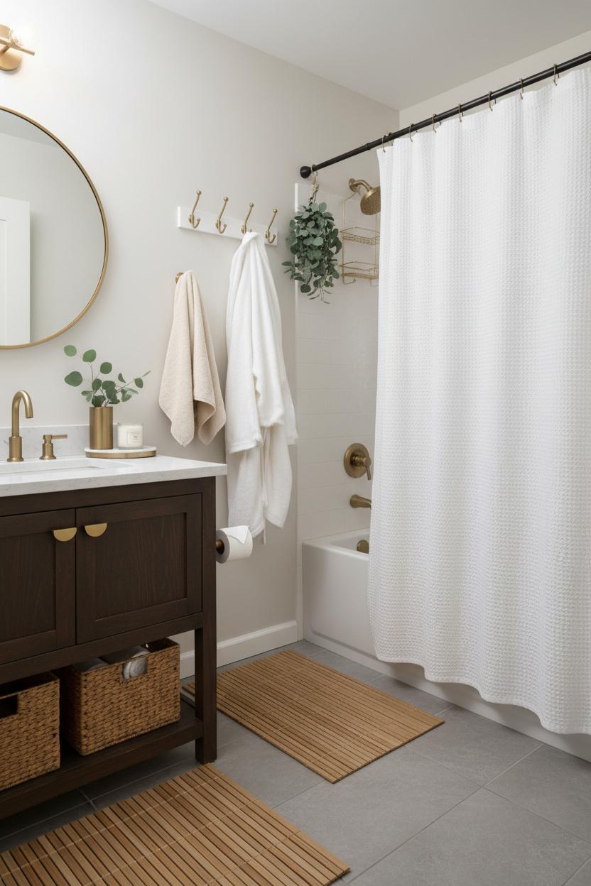 To pull the look together on a budget, repeat two or three materials throughout: the bamboo from your mat echoed in a canister lid, the soft stone from your bathroom accessories set mirrored in a soap dish, the matte gold reappearing in a frame or hook. If you can’t swap fixtures, style around them with warm-toned accents so the overall vibe still reads spa bathroom. Tuck a tiny plant by the sink, decant products into matching bottles, and keep surfaces edited so each piece feels intentional. With a few coordinated choices and renter-friendly tweaks, even the most compact bath can feel like a hush—simple, cohesive, and quietly luxurious.