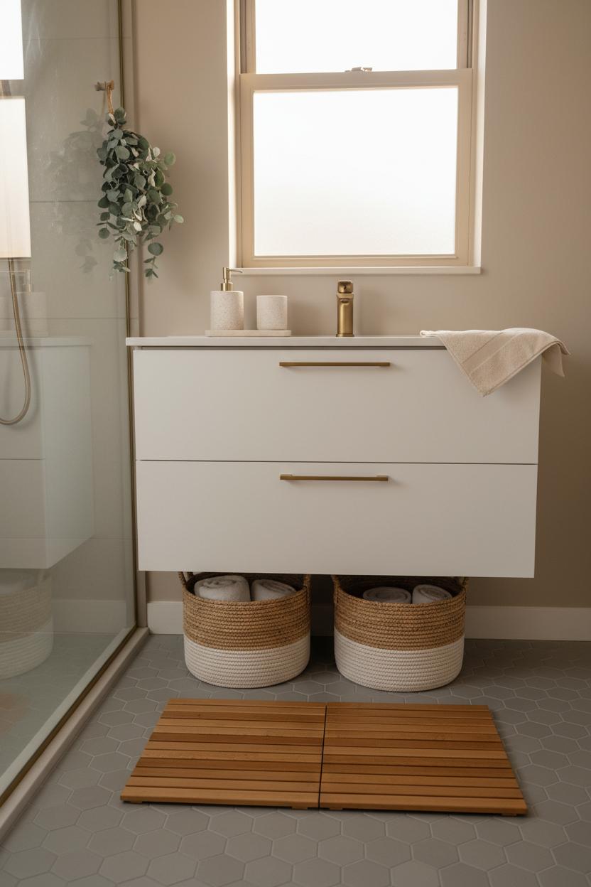 Layer in tactile touches that whisper “spa.” A bamboo bath mat adds warmth and dries quickly, giving you that spa slat moment by the tub or shower. Keep linens airy and neutral—soft white or sand towels folded on a ledge or hung neatly so the textures become part of your bathroom decor. For a sensory lift, hang a eucalyptus shower bundle from the shower head; it’s subtle, fresh, and elevates the daily routine. Corral the necessities in woven storage baskets so counters stay calm: one for hair tools, one for skincare, one slim catchall for guest extras. In small bathroom decor, vertical space is your best friend—stacked baskets, a narrow ladder shelf, or a slim tray on the tank keeps everything tidy and beautiful.