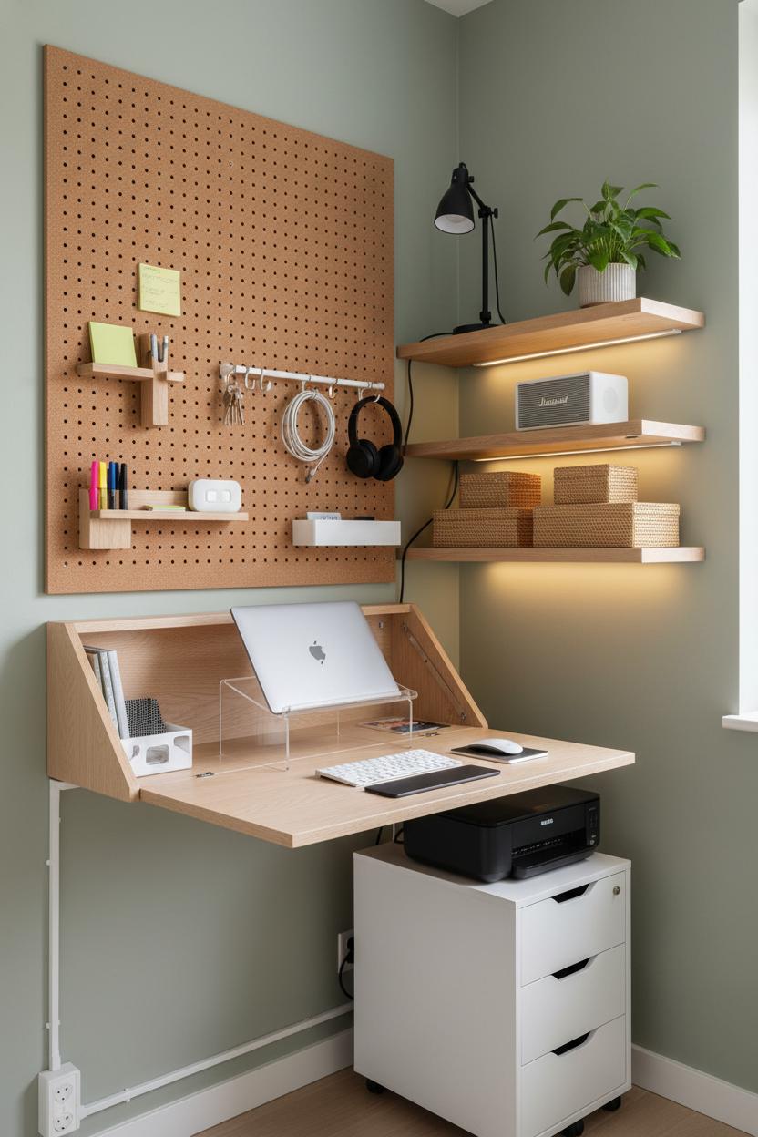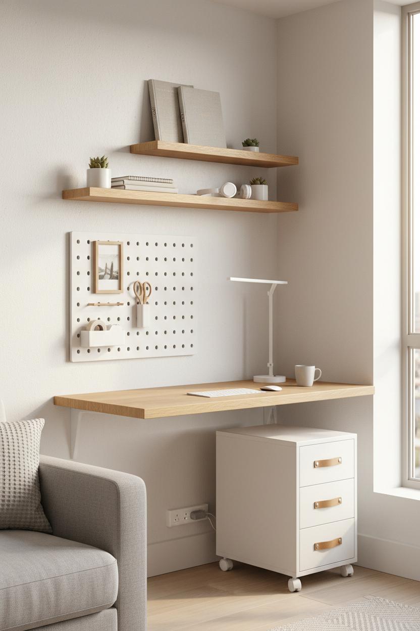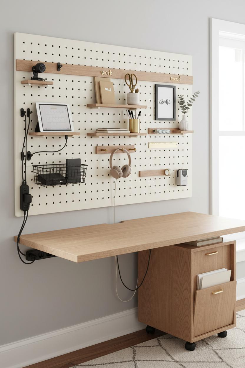 If you’re collecting small home office ideas and feeling stuck for surface space, think vertical. A pegboard organizer turns a blank wall into a hardworking backdrop that keeps tools, tech, and pretty things within arm’s reach, which is perfect for an apartment office where every inch has to multitask. Mount it behind a space-saving desk so your essentials float in front of you: notebooks on slim shelves, scissors and pens in cups, headphones on a sturdy hook, even a little ledge for your tablet. Pair it with a wall mounted desk to open up floor area, or a foldable desk that tucks away when you clock out—either way, you’ve created a vertical storage office that feels sleek instead of cramped.