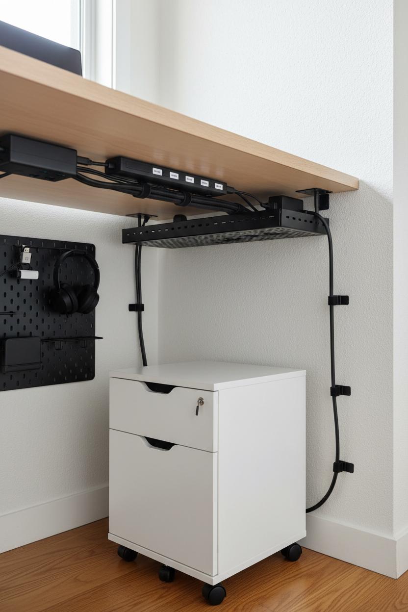 Start by mapping what actually needs to be plugged in. Mount a slim surge protector beneath your desktop with screws or heavy-duty adhesive, then feed cords into a shallow cable tray or low-profile raceway. Add a few adhesive clips along the back edge and down a leg to guide wires neatly to the floor. Bundle device cords with reusable Velcro ties and slip them into a braided sleeve for a single, tidy line. If your desk has a grommet, route everything through it; if not, stick a compact cable pass-through to the back. Label each plug so swapping gear is painless. Keeping cords off the floor clears the path for a rolling file cabinet to glide under and makes sweeping a two-minute job. This trick plays beautifully with a space-saving desk—whether you’re using a wall mounted desk that floats above baseboards or a foldable desk you stow on weekends, your setup looks sleek because the mess is tucked away.