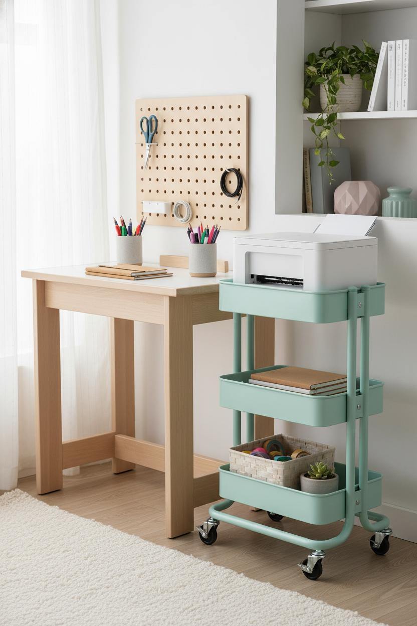 Lean into a vertical storage office mindset and make the stuff that doesn’t need wheels go up, so the things that do can move freely. A pegboard organizer above your desk keeps scissors, cables, and small tools visible and off surfaces, and portable caddies can lift down for craft-hour and tuck back up when you’re done. If your desk footprint is tight, pair a foldable desk with a narrow, roll-under cart that lives out of sight between sessions. For under desk cable management, use adhesive raceways and a mounted power strip so casters don’t snag—your cart should glide, not lasso cords. In truly small home office ideas, consider a low rolling bin that slides under the sofa or bed for seasonal files, and a handled file tote that “hot-desks” from kitchen table to balcony.