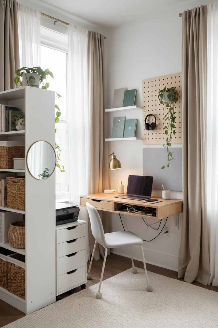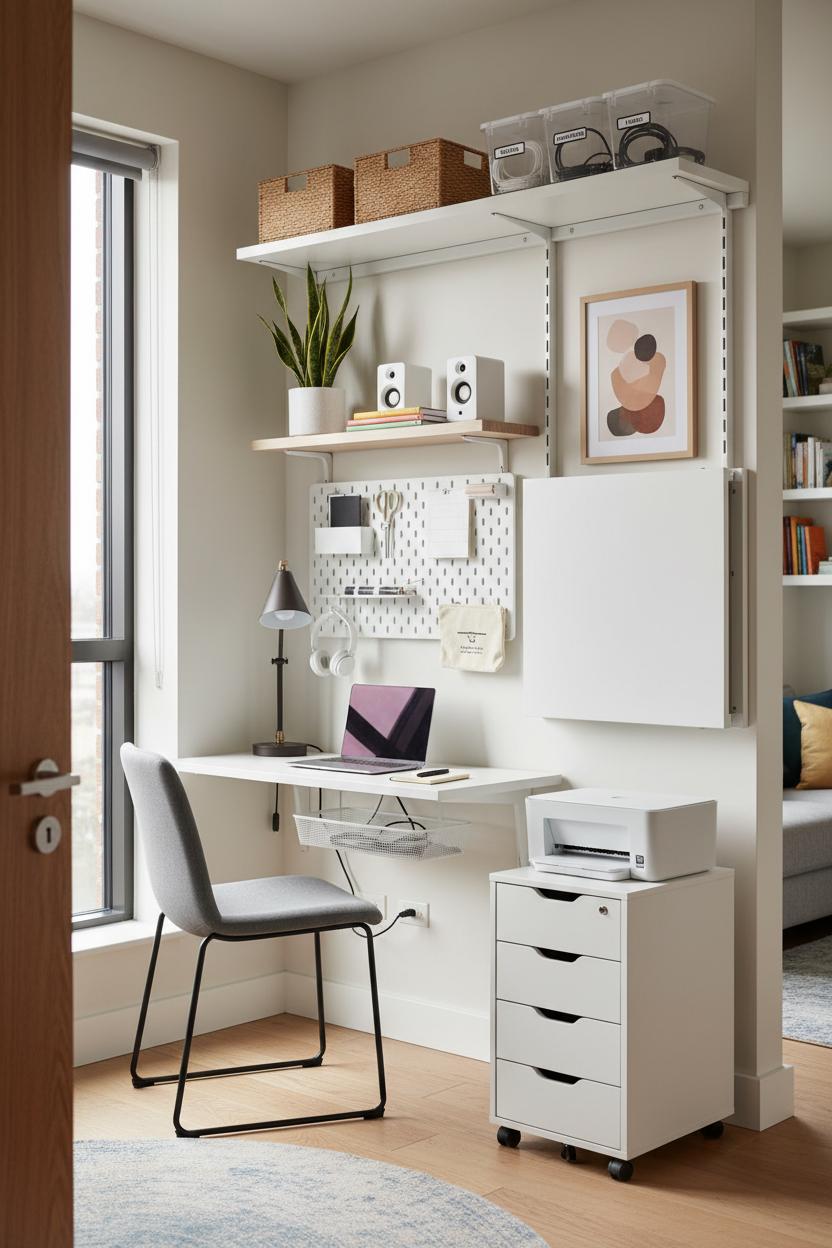 Creating an apartment office that feels calm and functional starts with claiming a quiet corner and building up, not out. If you can, tuck your desk near a window for natural light and add a simple sheer plus a heavier curtain to control glare and privacy on video calls. A wall mounted desk or a slim, foldable desk keeps a walkway clear while giving you a true workspace; look for a space-saving desk with a closed back so you can hide cords, then tame the rest with under desk cable management so it all looks airy. Embrace a vertical storage office plan: a pegboard organizer above your laptop holds pens, headphones, and a little plant, while narrow shelves corral notebooks. A petite rolling file cabinet can slide under or beside the desk to store papers and double as a printer perch. These small home office ideas let your work zone feel intentional without overtaking your living room.