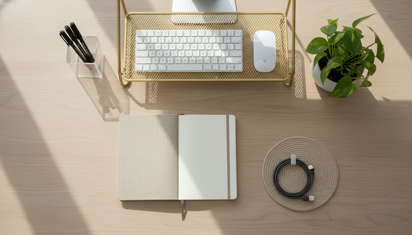 If cords are the thing cramping your style, a cable management box is the quiet hero of workspace organization. Tuck in the surge protector, coil the extras, and watch the visual noise disappear. Choose finishes that feel cohesive—matte black, warm brass, or light wood all read upscale on camera and IRL. Mixing one clear acrylic piece with wood grain and a hint of metal creates that airy, aesthetic desk moment you see on Pinterest, only it’s practical enough for everyday work. A slim tray for keys and earbuds, a petite ceramic cup for clips, and a low-profile notepad stack bring soft structure while keeping your office supplies within reach.