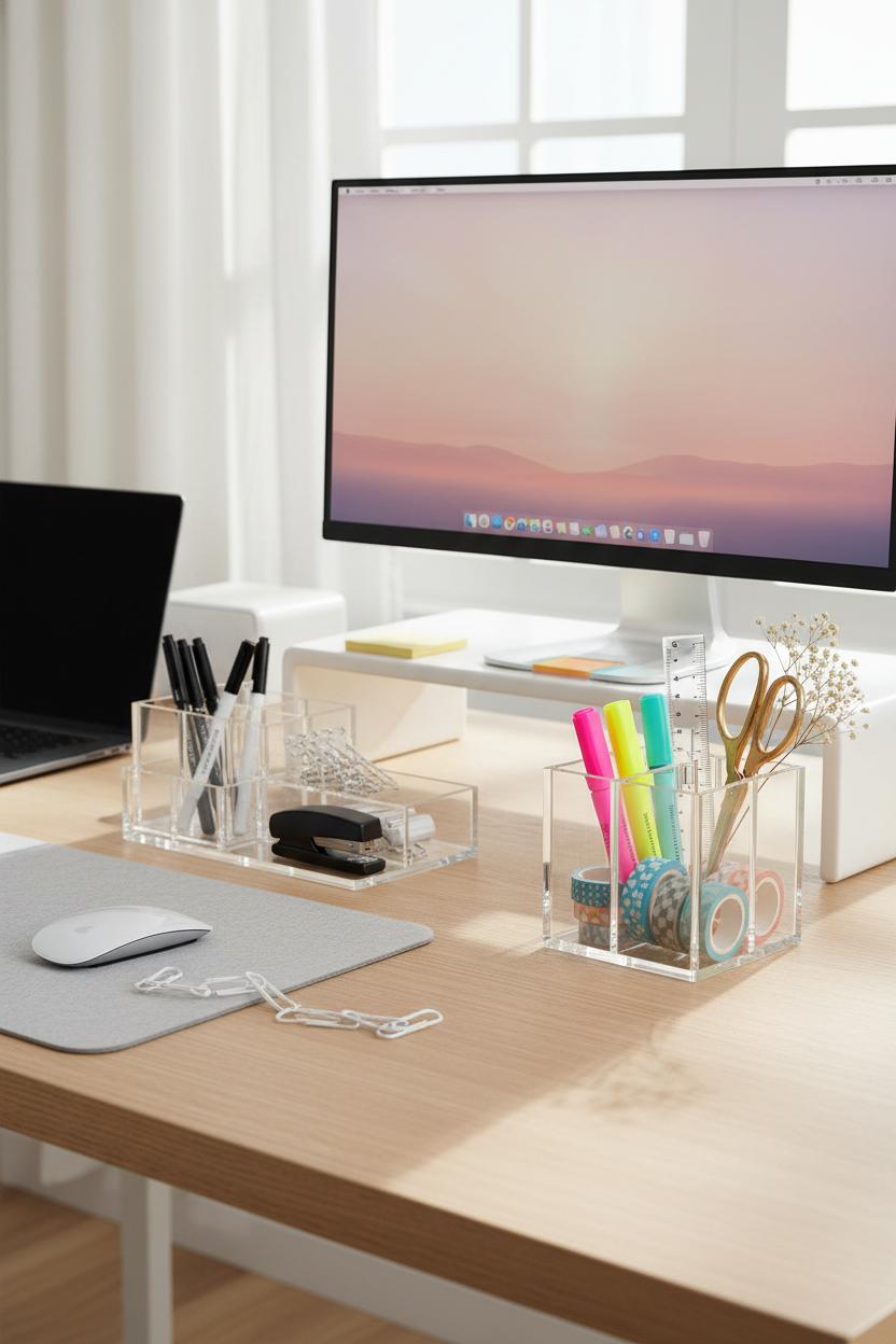 Picture the “before”: cords snaking across your keyboard, a leaning tower of notebooks, and pens that vanish when you need them most. Now, the “after”: calm, breathable space with just-right desk accessories that work as hard as they look. Start by defining your zones. Elevate your screen with a slim monitor stand so your posture thanks you, then slide your keyboard underneath when you need a clean slate. Keep your daily essentials corralled in a low-profile desk organizer—think sticky notes, charger, and a favorite highlighter—while an acrylic pen holder becomes the gleaming home for your go-to pens and scissors. The trick is to curate, not cram. Choose a tight color palette that complements your home office decor, and let your materials—clear acrylic, matte metal, warm wood—do the styling for you.