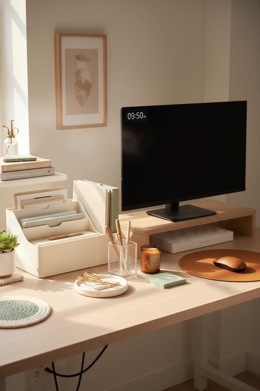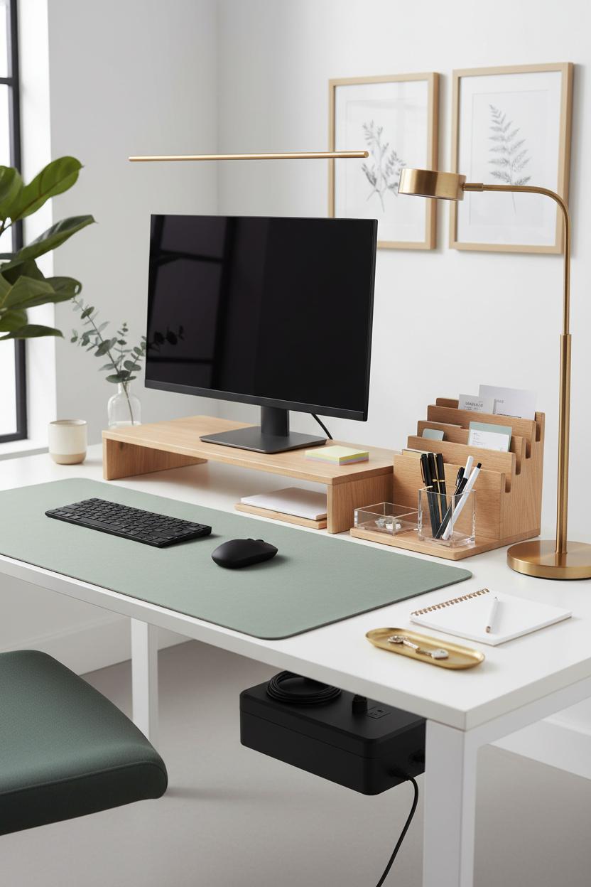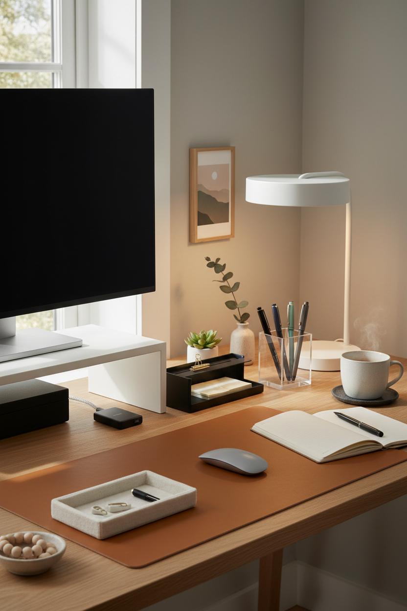 To make the whole space feel considered, think in palettes and repetition. Echo the tone of your monitor stand in your frames or lamp base, and let your desk organizer and acrylic pen holder share a finish so the eye reads them as a set. Keep the top of your desk mostly open—just a few hardworking pieces styled with intention—and let greenery do the rest. A tiny plant or sprig in a bud vase adds life without adding clutter. The result is a clean, calming workstation that looks luxe every day, because everything has a home, every cord is tucked away, and every item earns its keep in both function and form.